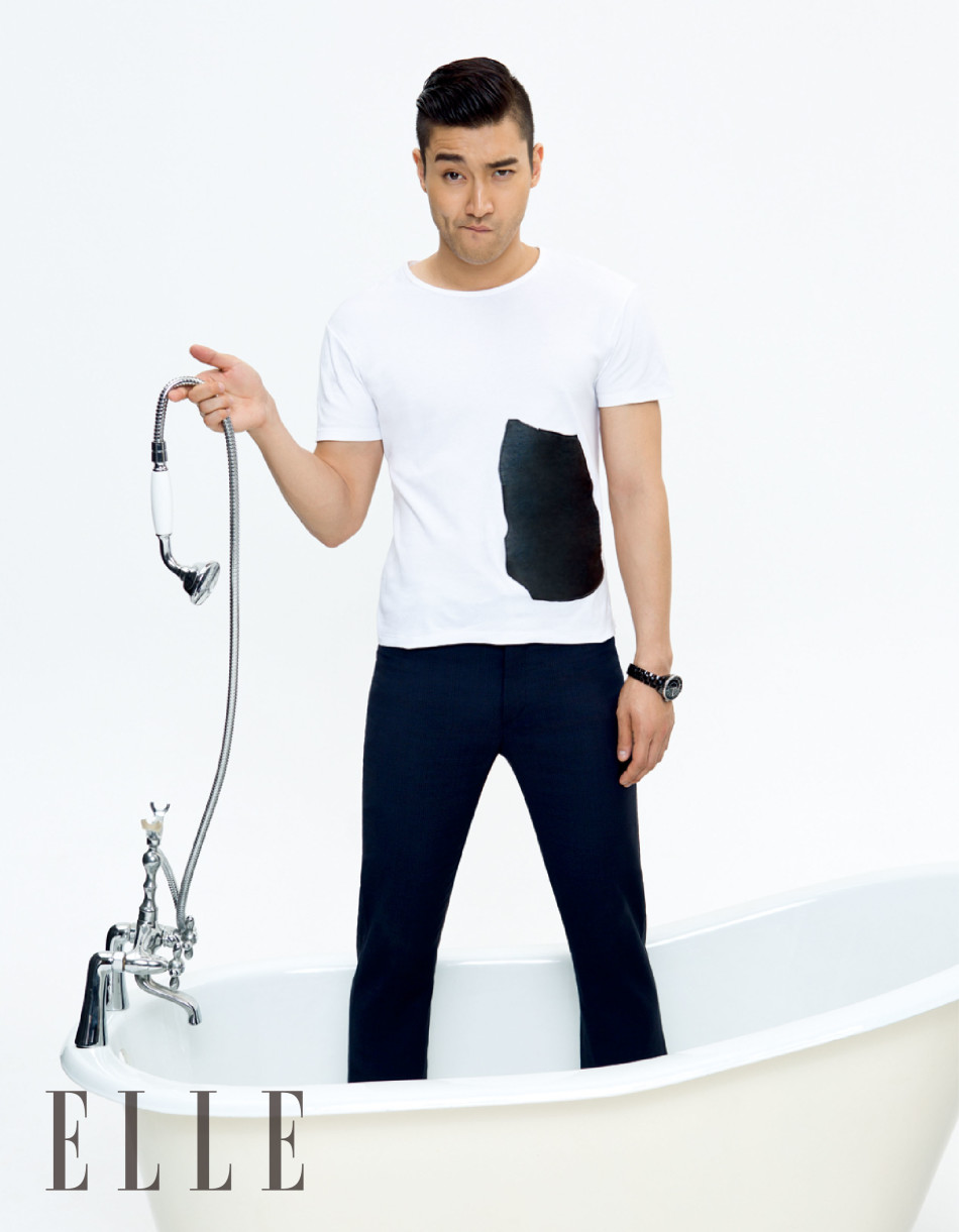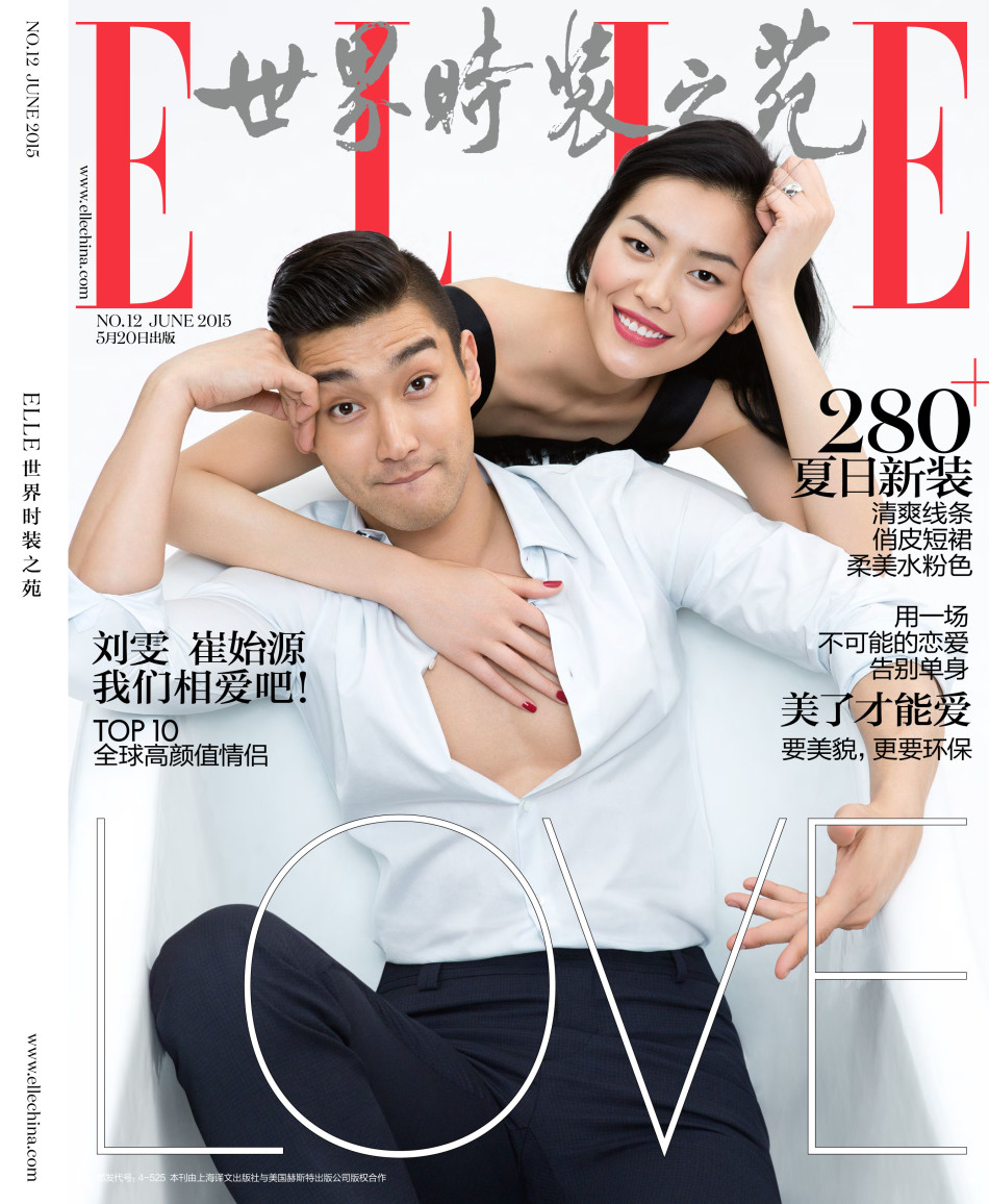 Actor and Super Junior member Choi Si-won links up with model turned actress Liu Wen for the June 2015 cover shoot of Elle China. Photographed by Zack Zhang, the theme is date night as the pair pose for infectious photos. Doing their best at his and her fashions, Choi and Wen are styled by Katherine Cao. / Hair by Zhang Fan. Makeup by He Leidong.