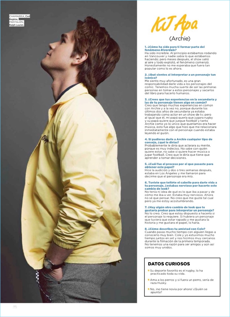 Riverdale stars Cole Sprouse and KJ Apa go retro for their latest photo shoot. The pair stars in Seventeen México’s November 2017 cover shoot. Los Angeles-based photographer Jon Wong captures the duo. Sprouse and Apa sport preppy fashions that include varsity jackets, bombers, and denim. Featured brands range from Tommy Hilfiger and American Rag to G-Star Raw. In other Sprouse news, this cover feature follows his new Converse campaign.