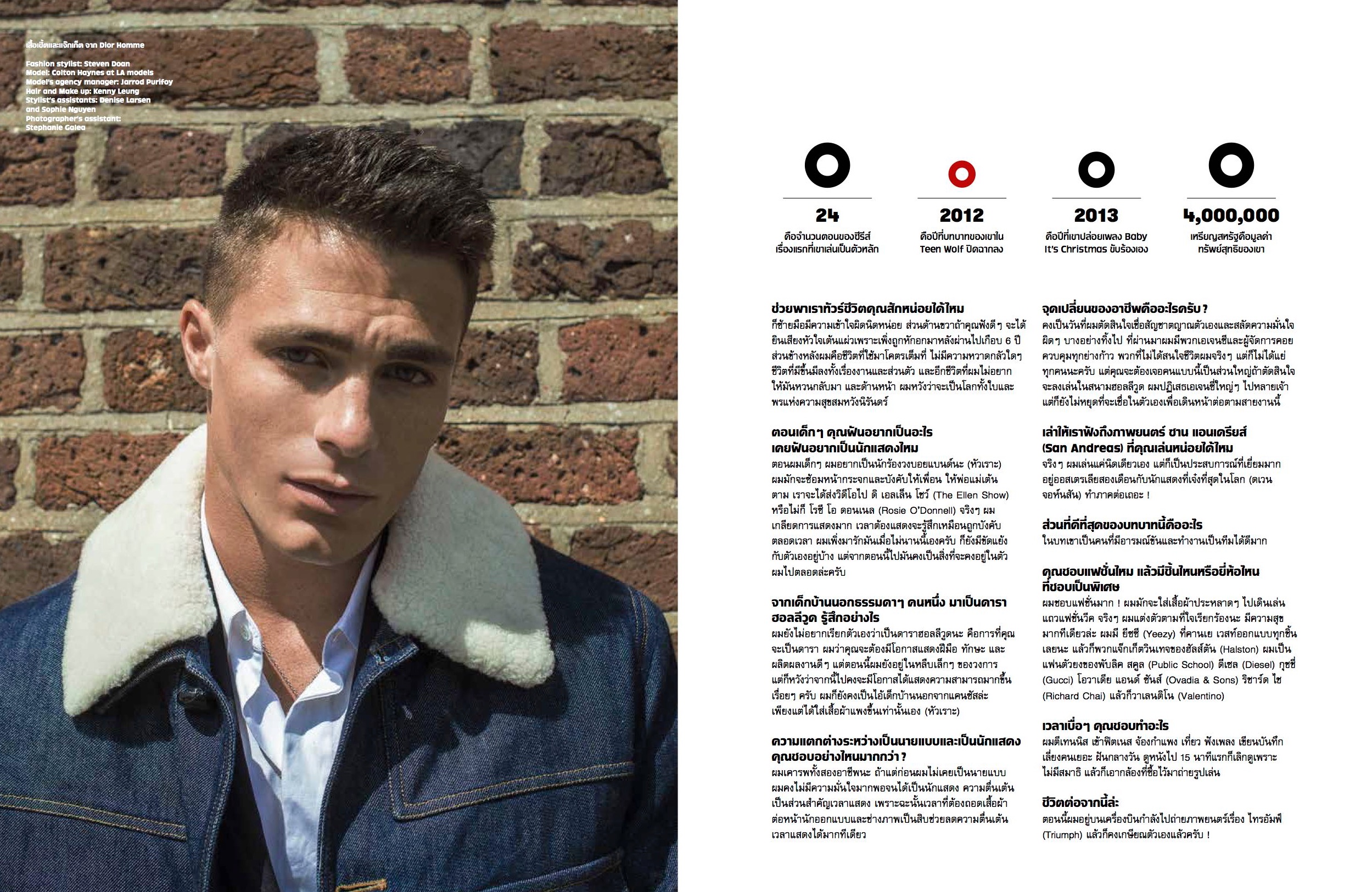 L’Optimum Thailand enlists actor Colton Haynes as its November 2015 cover star. Photographed by Oli Kearon with styling and art direction by Steven Doan (Wilhelmina One), Haynes dons designer fall fashions. Wearing sharp tailoring and smart sportswear, Haynes wardrobe includes choice pieces from brands such as Burberry Prorsum, Gucci, Valentino, Giorgio Armani and Canali.