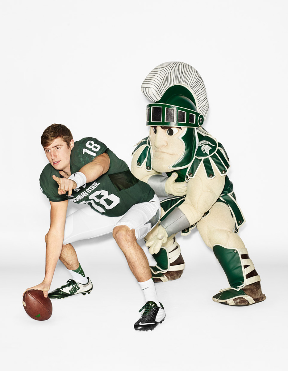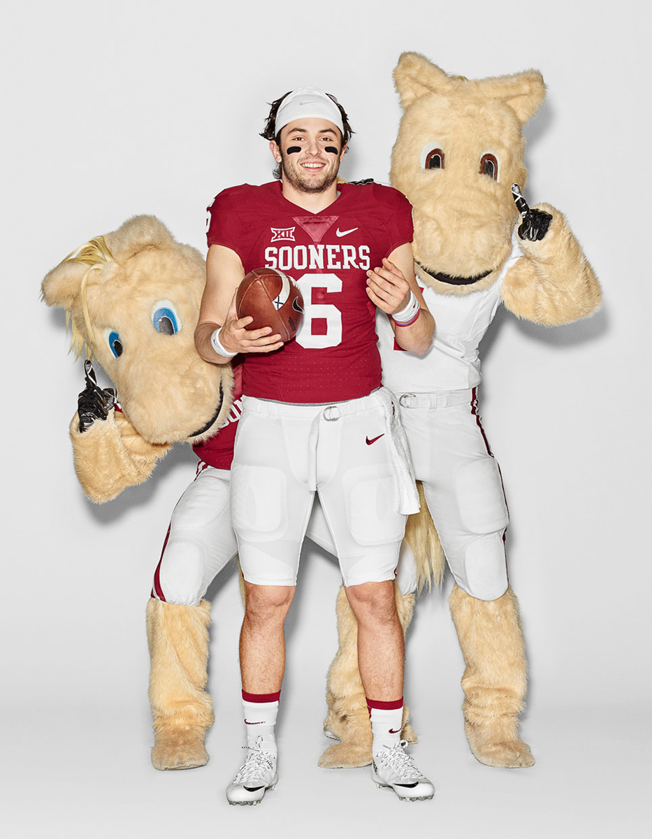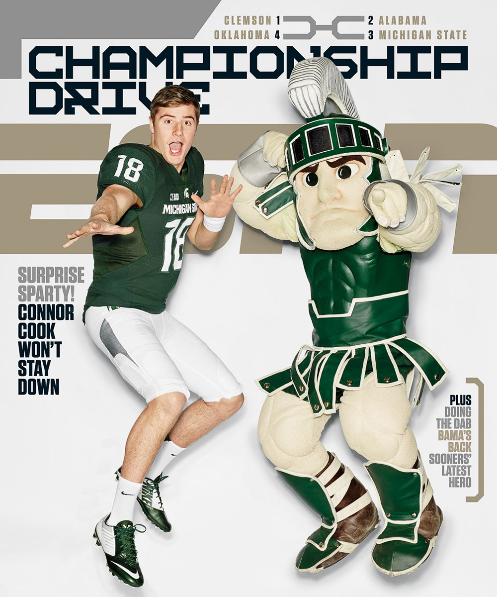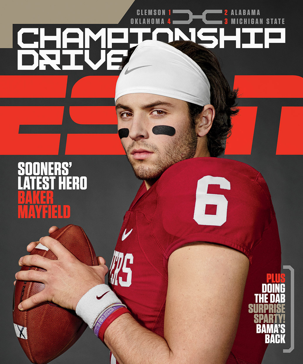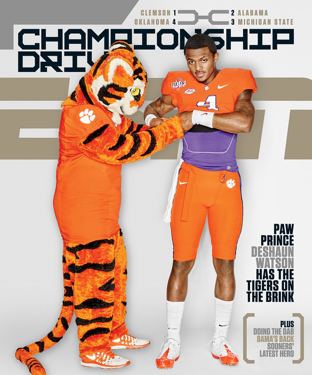 ESPN magazine embraces school spirit as college football players Connor Cook, Deshaun Watson and Baker Mayfield are featured as the issue’s cover stars. The trio is photographed by Dylan Coulter for the occasion. Hitting the studio and posing with their school mascots, the players are a spirited vision.