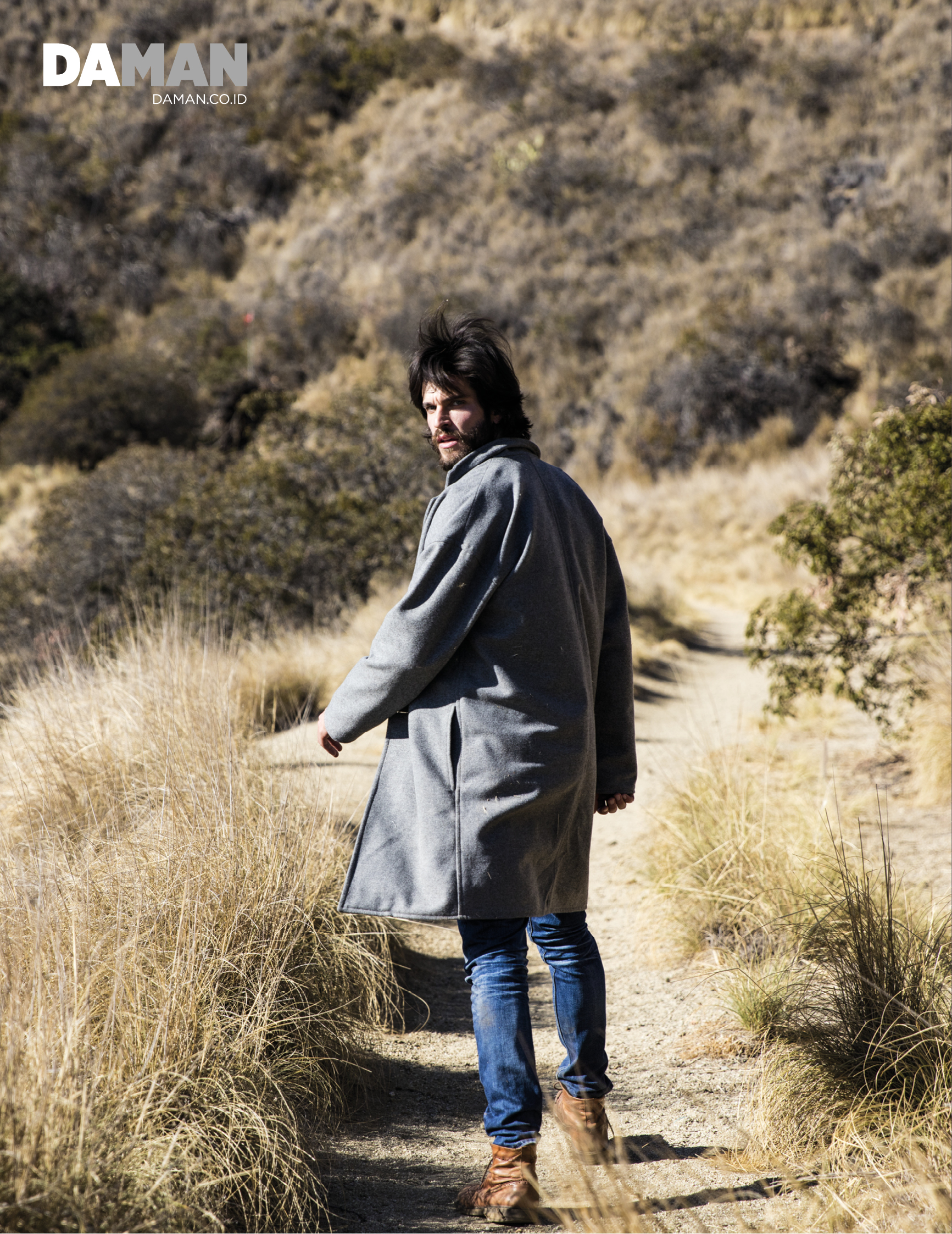 Wearing a coat from Represent, Daniel di Tomasso is photographed in the hills of California.