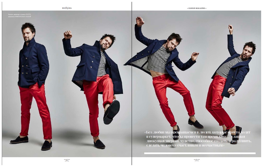 After connecting with Danila Kozlovsky for the January 2015 issue of GQ Russia, stylist Vadim Galaganov reunites with the actor for NARGIS. Shooting a story for the magazine’s April 2015 issue, Kozlovsky is all smiles as he poses for lively images by Danil Golovkin. / Grooming by Alena Moiseeva. Production by Tatiana Pronskaya.