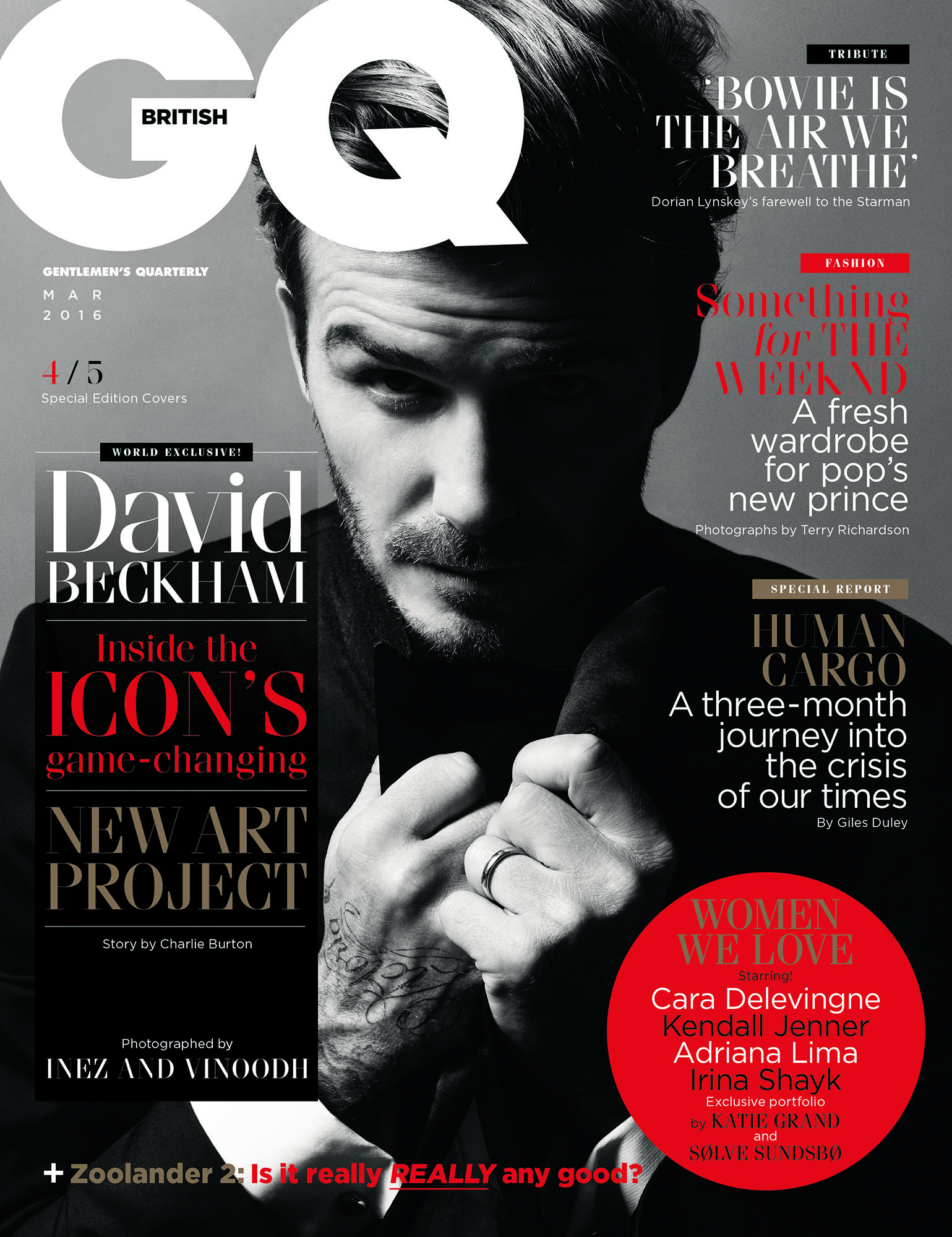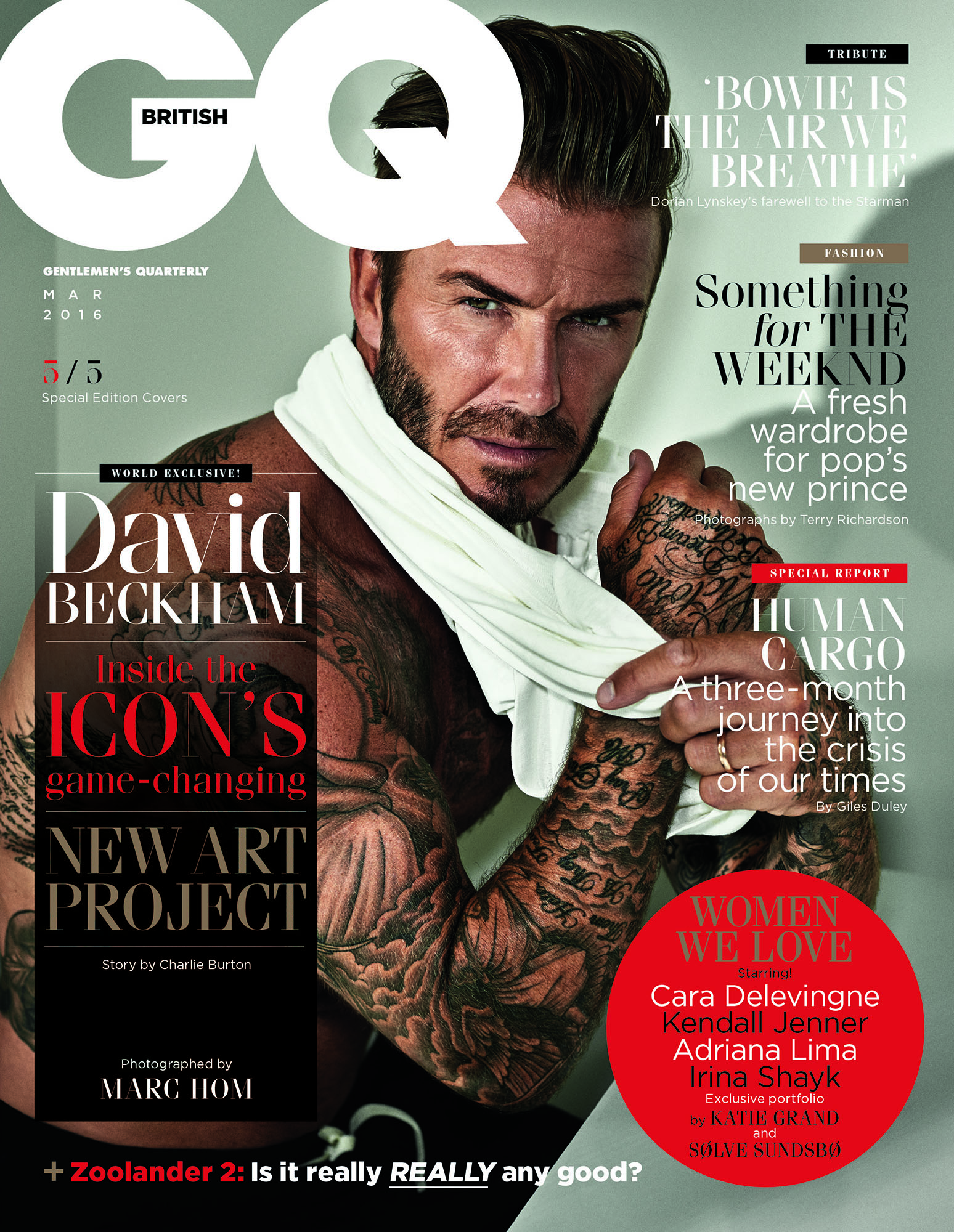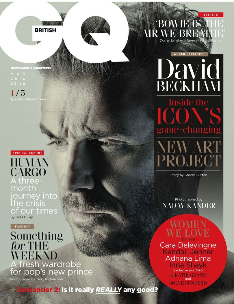 British GQ features David Beckham once more with the star gracing the cover of the magazine’s March 2016 issue. Spotlighting Beckham’s photo shoots throughout the years, five special edition covers are provided with images by Nadav Kander, Inez & Vinoodh, Vincent Peters and Marc Hom. The cover story brings attention to an exhibition at London’s Phillips Galleries, where portraits of Beckham are being auctioned off to support The David Beckham UNICEF Fund.