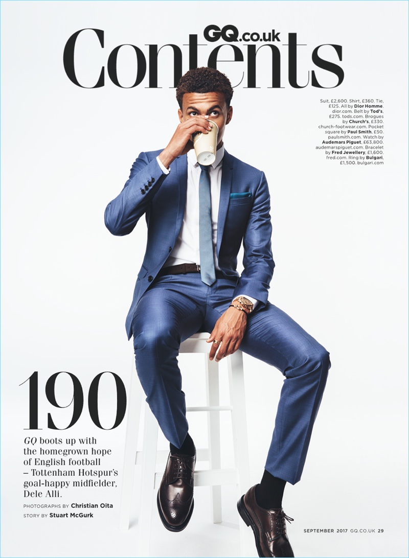 English soccer player Dele Alli graces the pages of British GQ’s September 2017 issue. The midfielder suits up for the occasion, linking up with photographer Christian Oita. Alli not only wears a sharp Dior Homme suit, but showcases sportswear from brands like Brunello Cucinelli. Stylist Elgar Johnson also incorporates a mix of labels such as Paul Smith and Berluti. Read Alli’s British GQ feature on GQ-Magazine.co.uk.