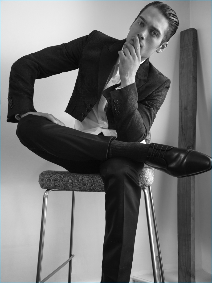 Dylan Sprayberry strikes quite the pose in a Dior Homme tuxedo jacket with a shirt, trousers and shoes from Dsquared2.