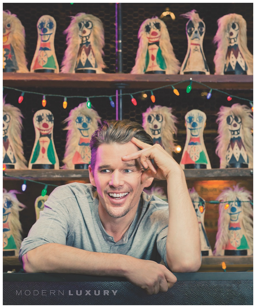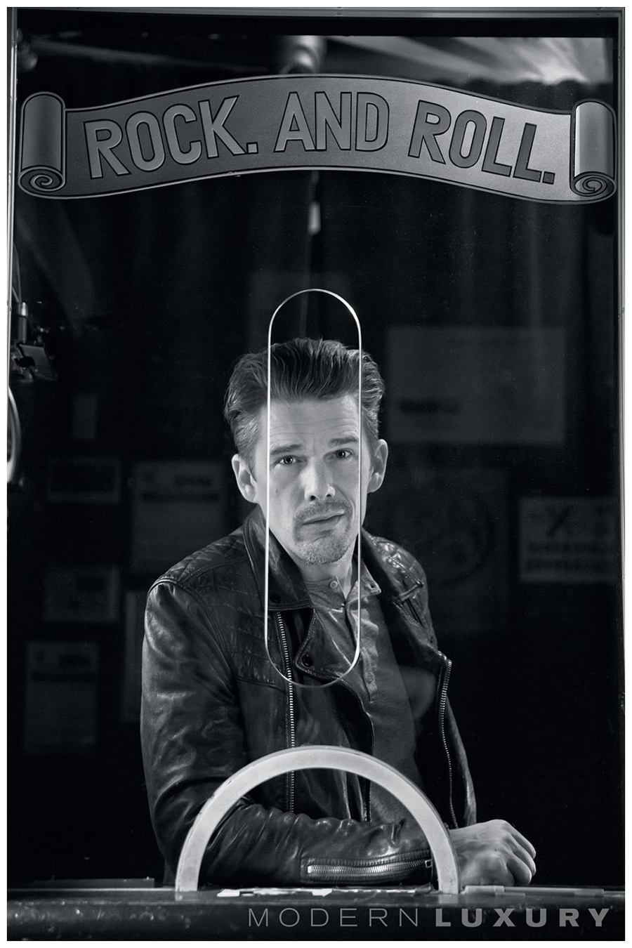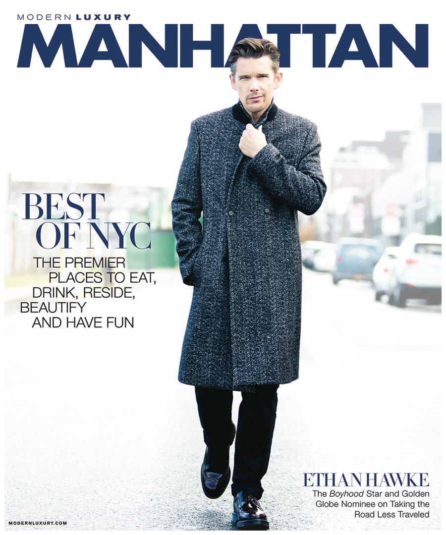 Photographed by Justin Jay, Boyhood actor Ethan Hawke covers the January/February 2015 edition of Manhattan magazine. Discussing taking up residence in Brooklyn Heights, the 44 year-old actor shares, “The whole city’s changing, while Brooklyn feels to me the way New York was a while ago. Brooklyn is about the barometric pressure of New York turned down about 20 points.”