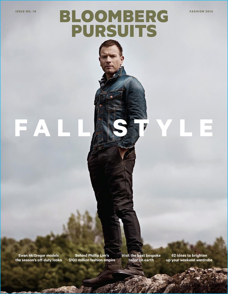 Ewan McGregor covers the fall 2016 edition of Bloomberg Pursuits in a Nudie Jeans denim jacket, Alternative Apparel henley, Fabric Brand pants, Burberry London scarf, and O'Keeffe boots.Pin