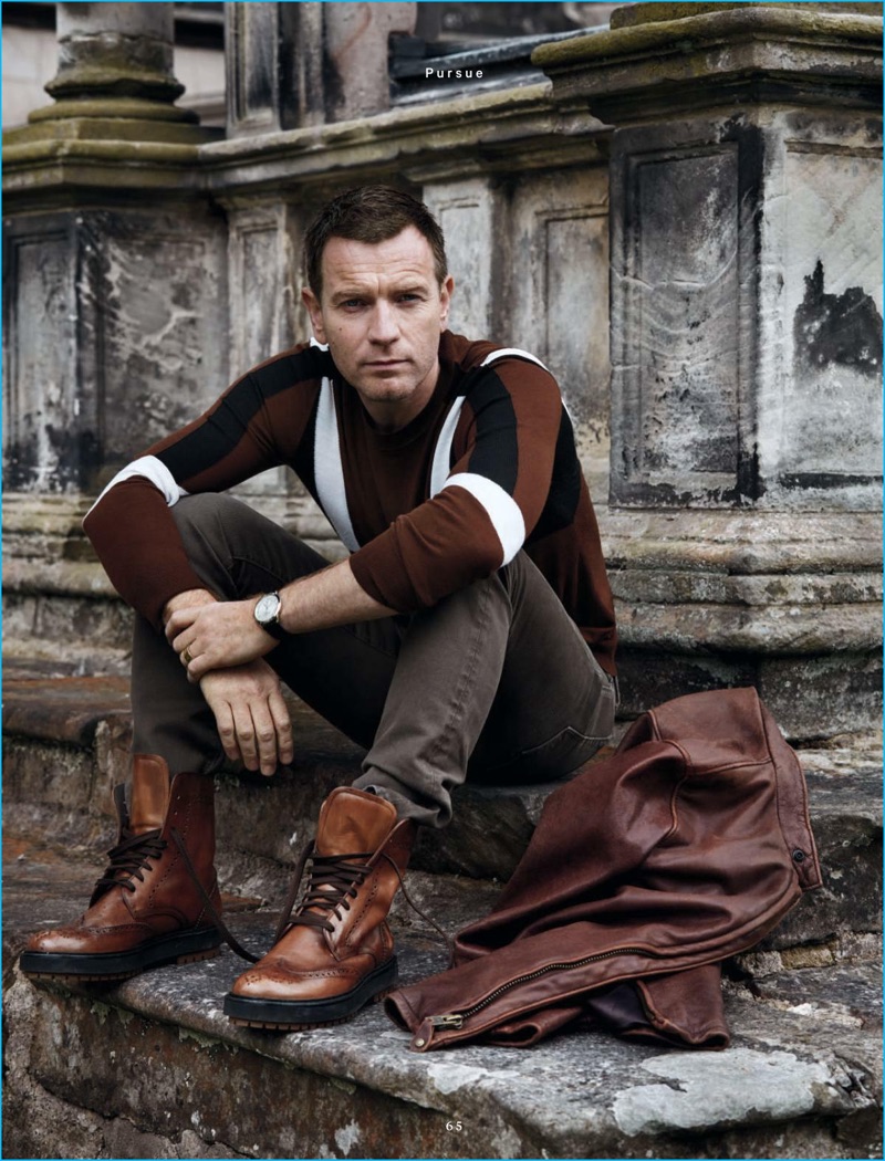 Ewan McGregor makes a rich fall statement in a Neil Barrett sweater with Tom Ford corduroy pants, a leather jacket by Scott and a Hermes watch with Tod’s boots.