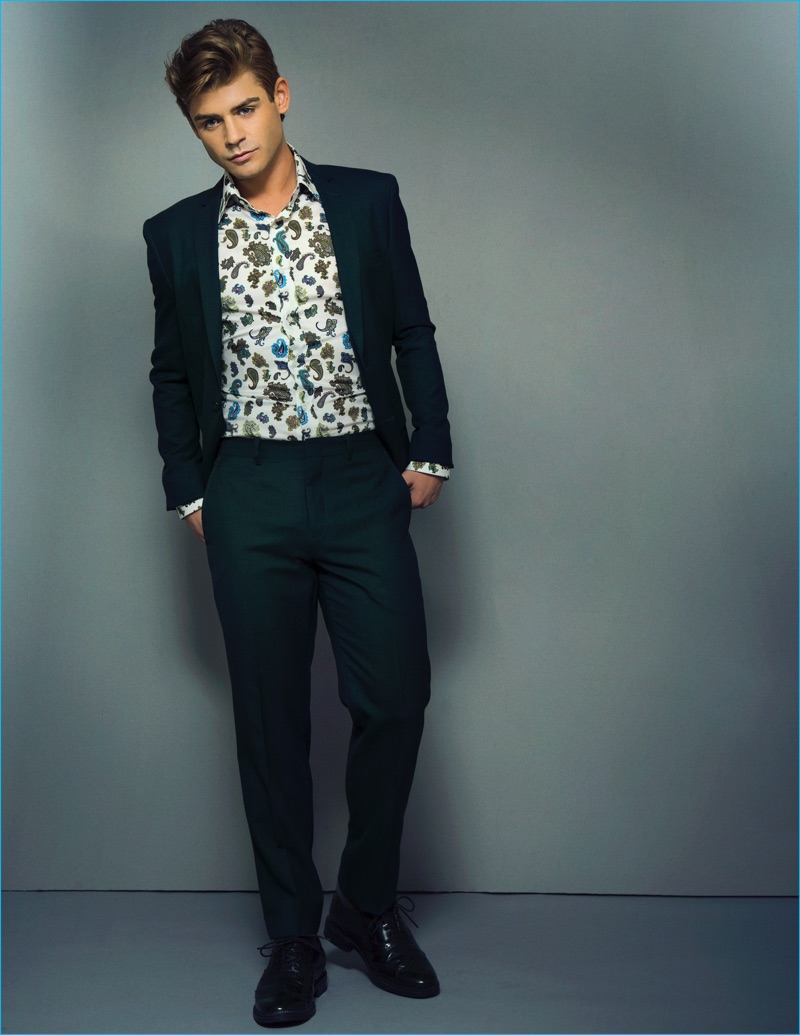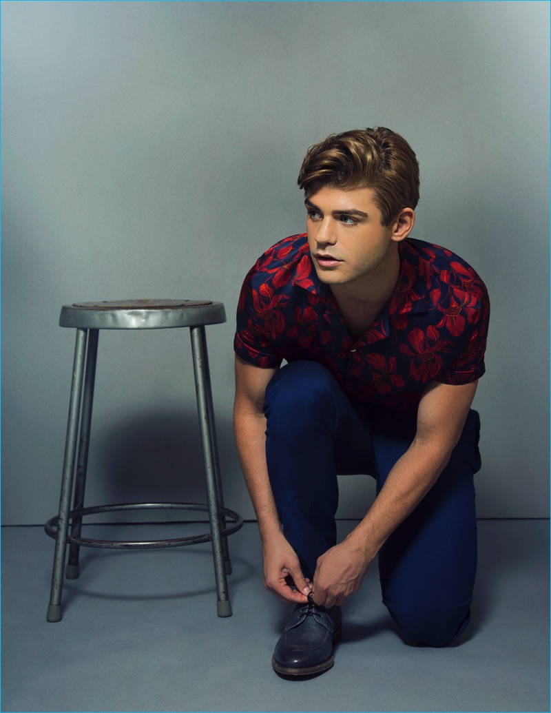 Appearing in a Ferrvor photo shoot, Garrett Clayton sports a shirt and pants from Zara with John Varvatos shoes.