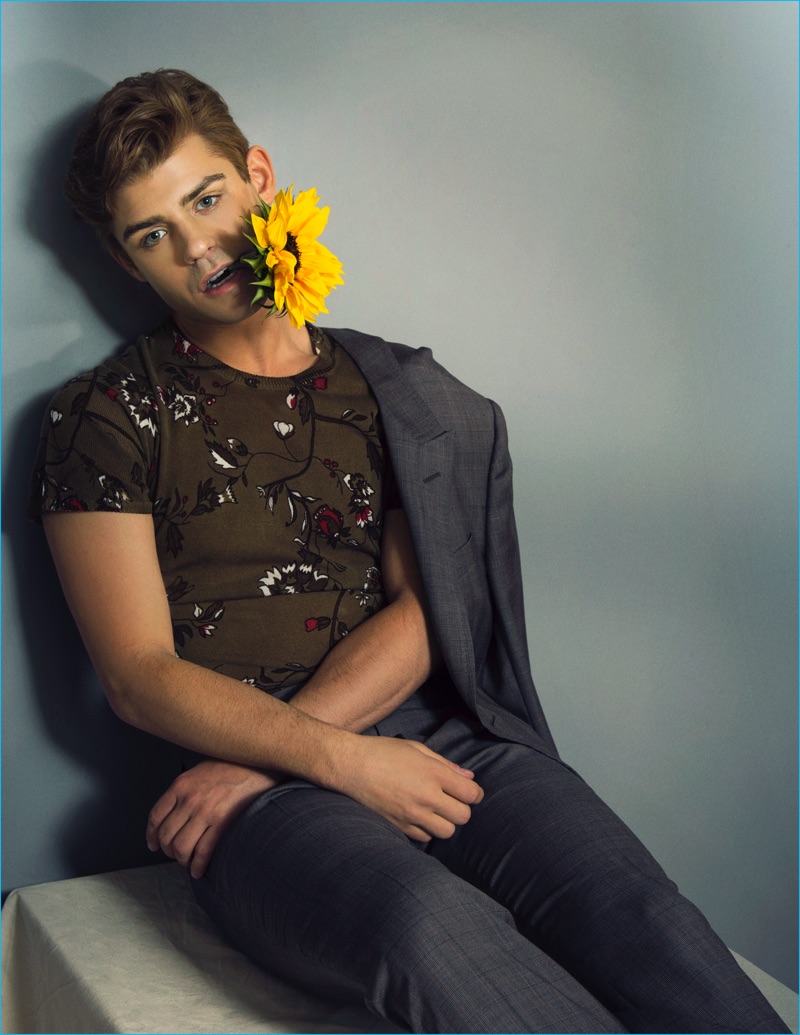 Donning a floral print sweater from Zara, Garrett Clayton sports a check Gucci suit.