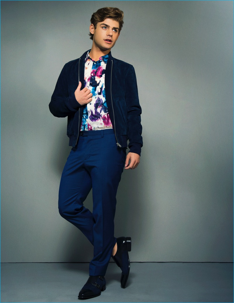 Garrett Clayton wears Theory trousers and Mezlan shoes with a shirt and bomber jacket from Sandro.Pin