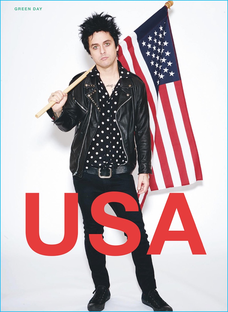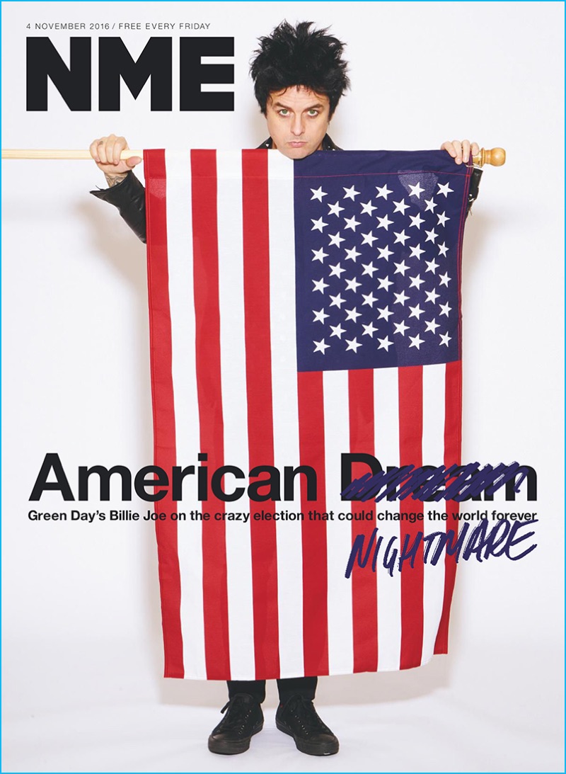 Green Day frontman Billie Joe Armstrong covers the November 4, 2016 issue of NME magazine. Armstrong joins his bandmates Tré Cool and Mike Dirnt for a photo studio session with photographer Matt Salacuse. On the heels of Green Day’s twelfth studio album, Revolution Radio, Armstrong gets political.