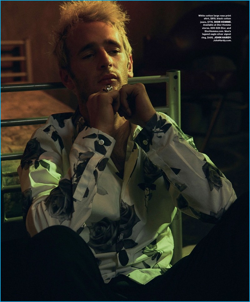 Hopper Penn dons a rose print shirt from Parisian label Dior Homme.