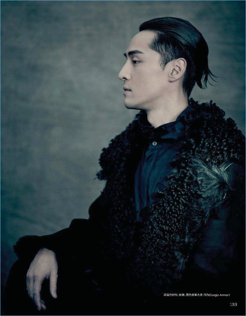 One of China’s largest stars, Hu Ge covers the June 2018 issue of Vogue China. He joins Dutch model Luna Bijl for a dark fall story photographed by Paolo Roversi. The Italian photographer brings his signature vision to the story. A dark romanticism sets the tone. It’s here that dressed to impress, Hu Ge dons pieces from the fall-winter 2018 collection of Giorgio Armani. The Chinese actor wears elegant tailoring juxtaposed with the rich opulence of shearling, velvet, and suede.