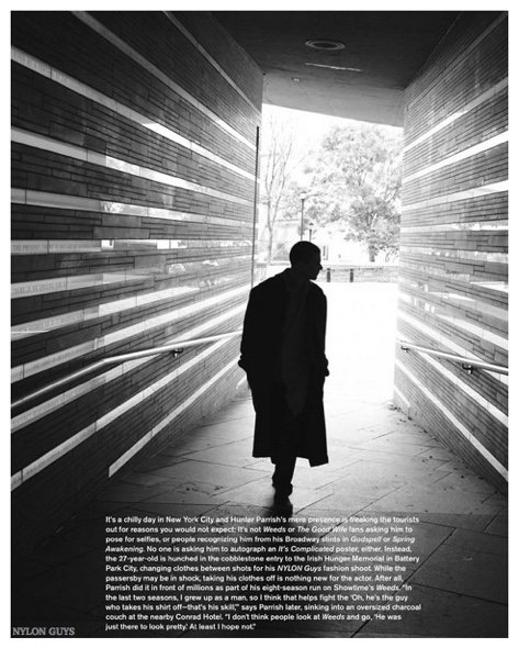 Hunter Parrish, best known for his role as Silas Botwin in Showtime television series Weeds, connects with Nylon Guys for its December 2014/January 2015 issue. Gearing up for a cold winter, Parrish is captured in Battery Park City as he models coats and knitwear from the likes of Prada and Louis Vuitton.
