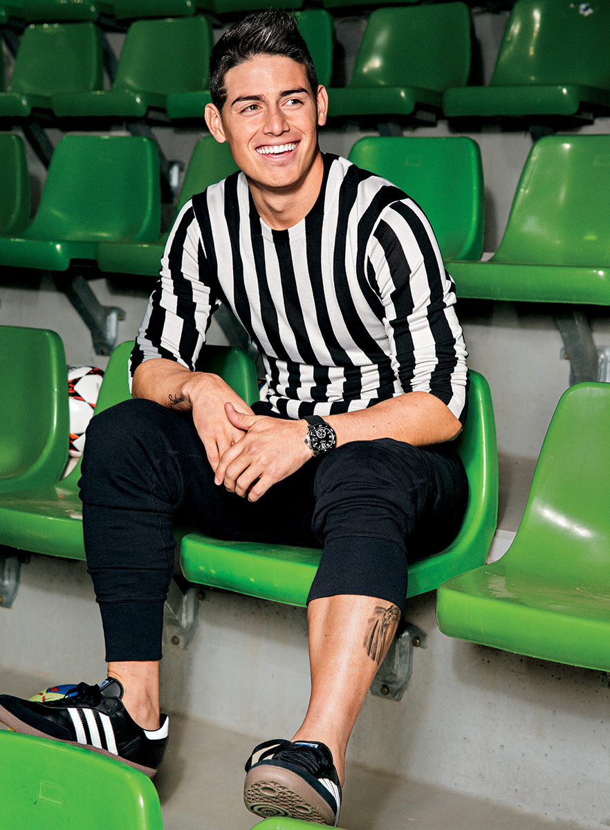 Pegged as the next Cristiano Ronaldo, Colombian footballer James Rodriguez appears in a cheeky spread for the May 2015 issue of GQ. Rodriguez is photographed by Ben Watts for the sporty photo shoot. Pictured in black and white fashions, the footballer dons pieces from Givenchy, Adidas Originals and more.