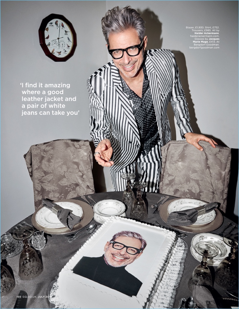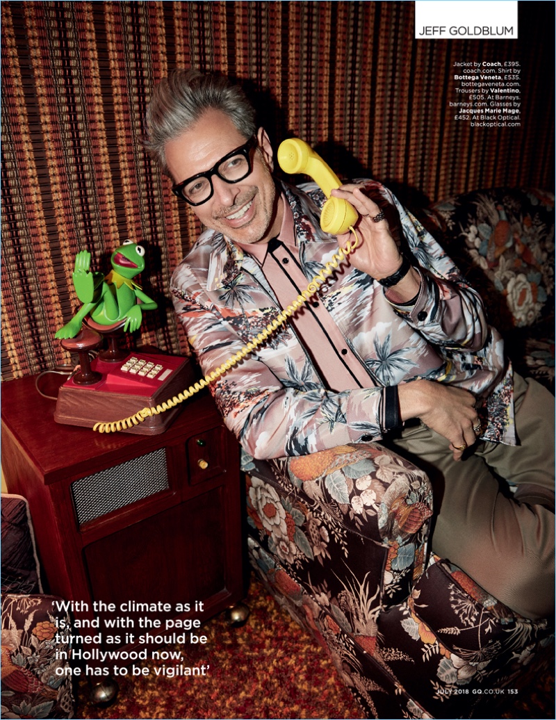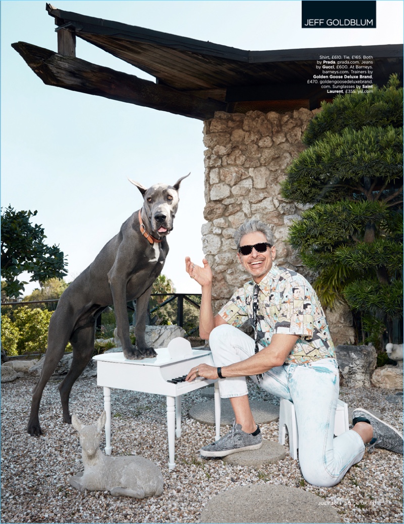 Jeff Goldblum is the embodiment of summertime fun. The 65-year-old actor covers the July 2018 issue of British GQ. Posing poolside, Goldblum is photographed by Doug Inglish. Meanwhile, his designer wardrobe, which includes Saint Laurent, is styled by Andrew T. Vottero. Connecting with British GQ, Goldblum talks about the climate of Hollywood today.
