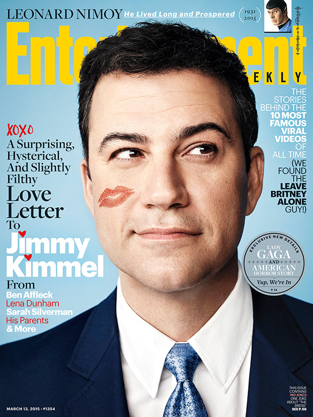 Posing for a close-up against a light blue background, television host Jimmy Kimmel is photographed by Art Streiber for the March 13, 2015 issue of Entertainment Weekly. The magazine catches up with the people closest to Kimmel for a more intimate look at the Jimmy Kimmel Live! personality. His wife Molly McNearney reveals, “Our Christmas cards and stationery are all handmade by him; our wedding invitation, he drew.” She continues, “He makes vinegar, he makes pasta from scratch. He really is Martha Stewart. I’ve never met a man that’s so feminine and so masculine at the same time.” Read more at EW.com.