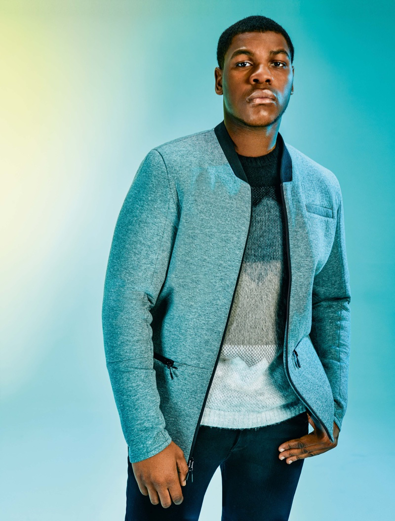 John Boyega sports an ASOS bomber jacket and cozy knit sweater.