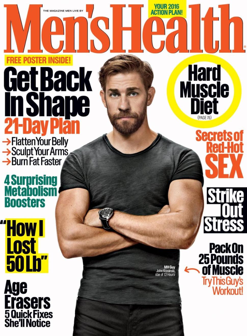 John Krasinski of The Office fame is in the best shape of his life. The cover star of the January/February 2016 issue of Men’s Health, Krasinski talks about getting into shape for 13 Hours: The Secret Soldiers of Benghazi. In the film, Krasinski plays a Navy SEAL. Talking about getting into shape, the 36 year-old actor shares, “I think there’s a part of you where you become addicted to it. I love feeling strong. You pick up your daughter with ease while everyone else makes a little grunt when they pick up their kids. I walk with better posture and a little more presence. I was more of a sit-in-the-corner guy. Now I’m a lot less of that.”