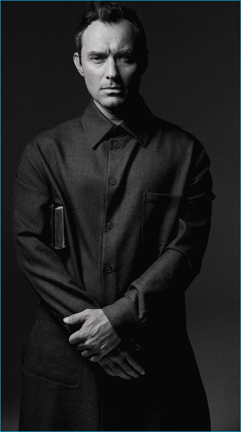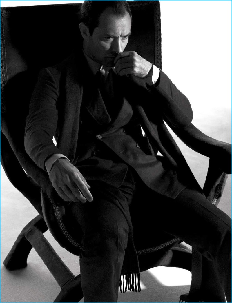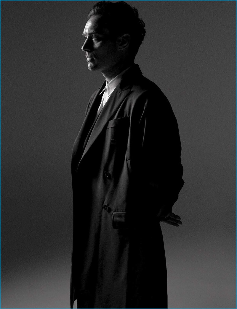 In addition to Andrew Garfield, Italian magazine L’Uomo Vogue enlists Jude Law for a September 2016 cover story. Photographed by Tom Munro, Law takes a seat in an oversized coat, paired with slim tailoring. Posing for moody images, the 43-year-old actor is styled by Robert Rabensteiner, wearing labels such as Dior Homme and Prada.