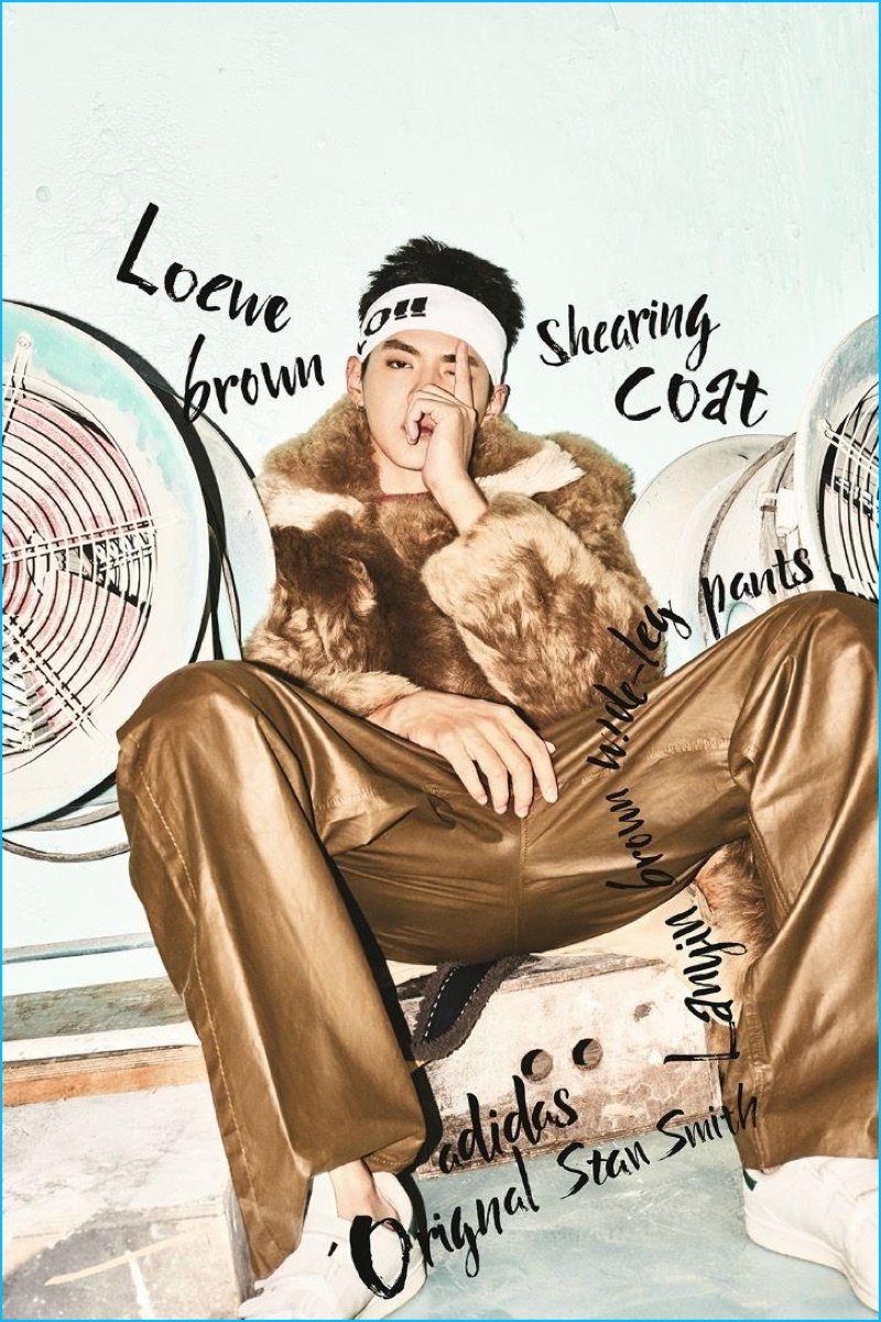PinChanneling a geek chic look, Kris Wu wears a Human cuban collared shirt with a Ground Zero scarf.PinThe life of the party, Kris Wu dons a Loewe shearling coat and Lanvin wide-leg pants for YOHO!