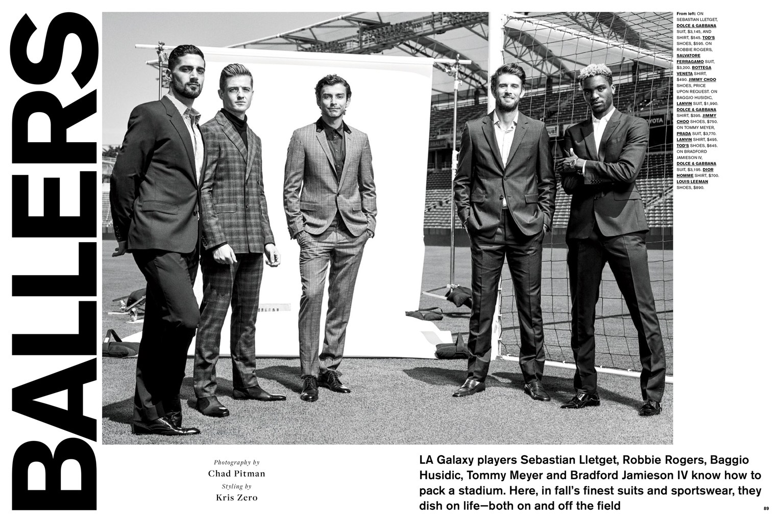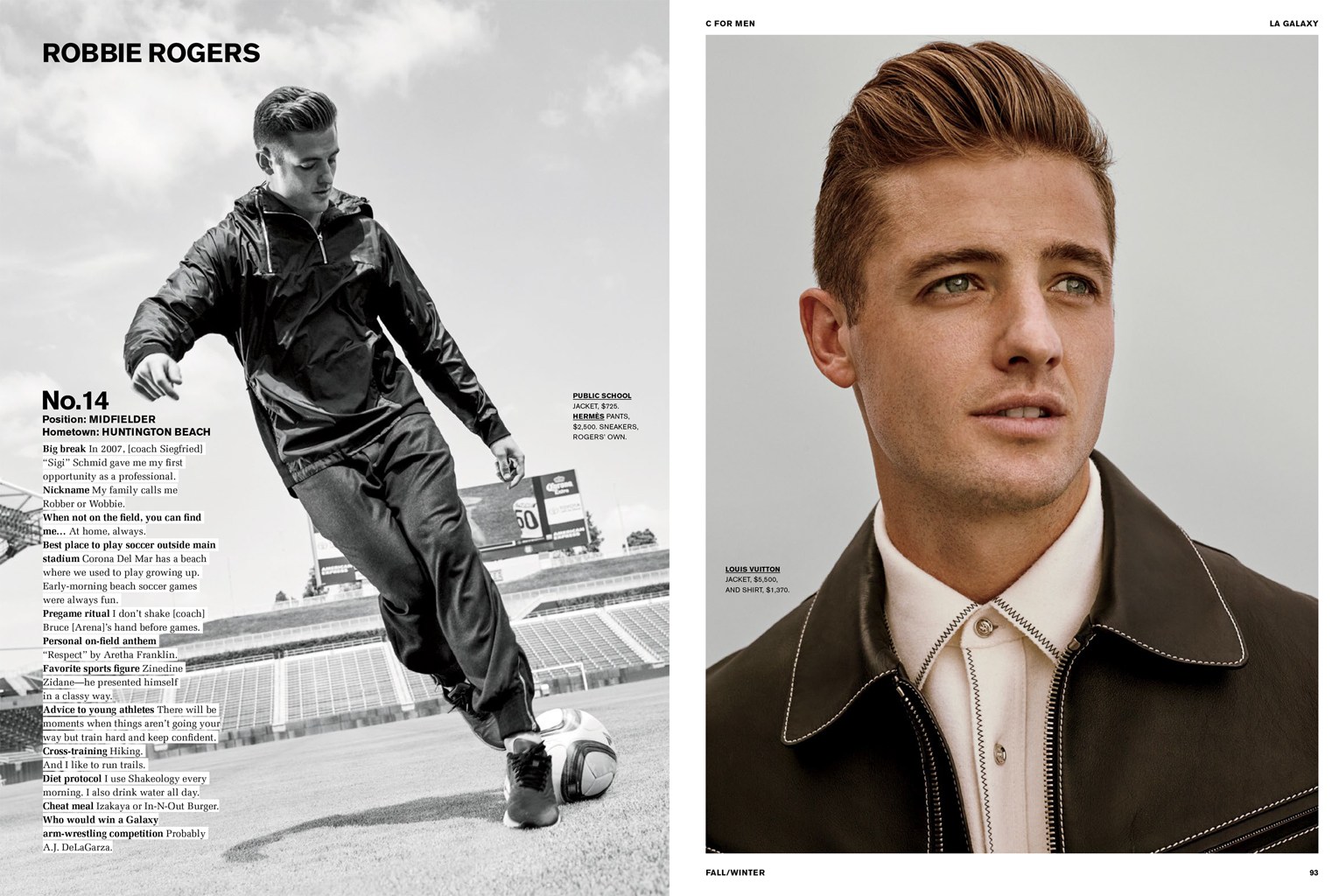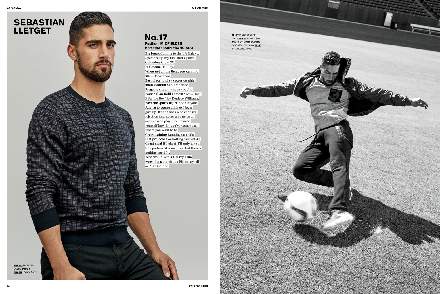 LA Galaxy players suit up for a new feature from C For Men. Hitting the stadium for sporty images, soccer players Sebastian Lletget, Robbie Rogers, Baggio Husidic, Tommy Meyer and Bradford Jamieson IV show off a more chic side in studio images. Styled by Kris Zero, the athletic lot are featured in fashions from Dolce & Gabbana, Louis Vuitton, Marc by Marc Jacobs and other brands.