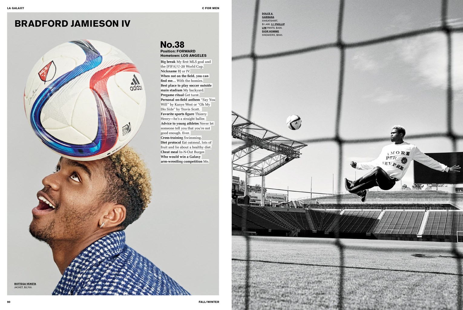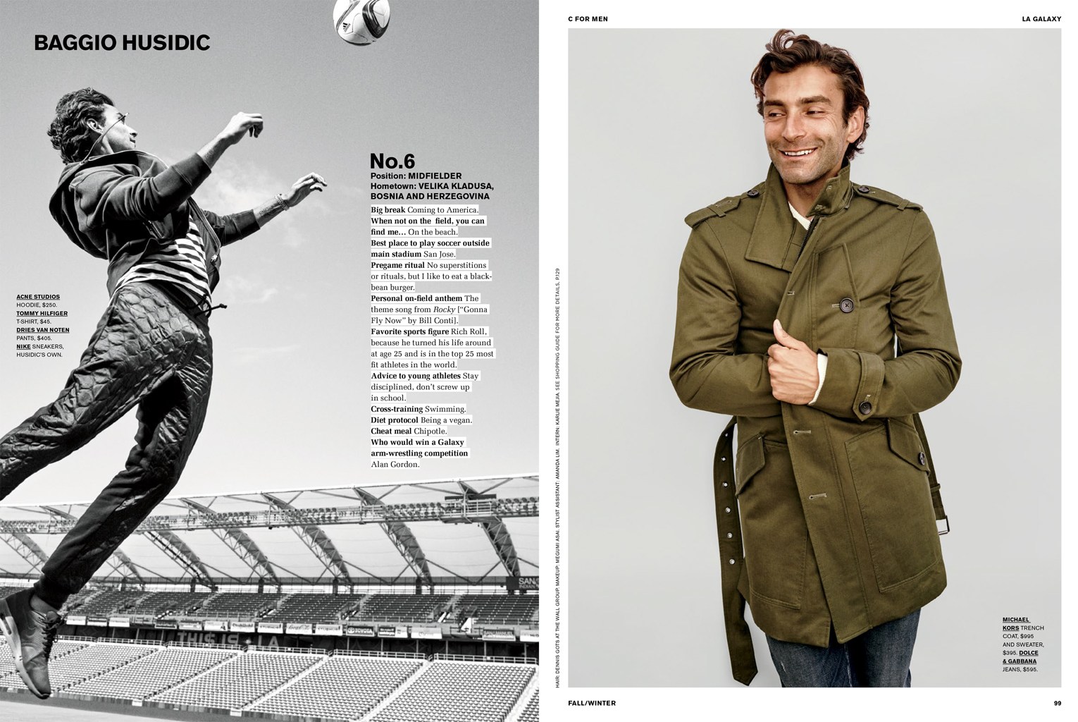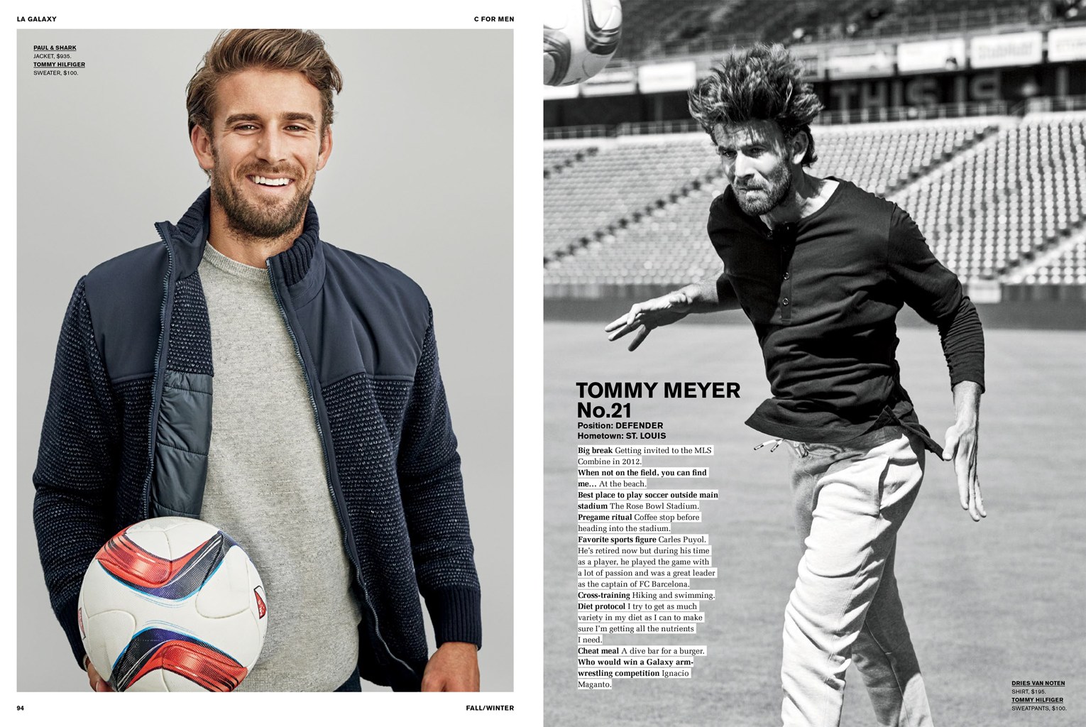LA Galaxy players suit up for a new feature from C For Men. Hitting the stadium for sporty images, soccer players Sebastian Lletget, Robbie Rogers, Baggio Husidic, Tommy Meyer and Bradford Jamieson IV show off a more chic side in studio images. Styled by Kris Zero, the athletic lot are featured in fashions from Dolce & Gabbana, Louis Vuitton, Marc by Marc Jacobs and other brands.