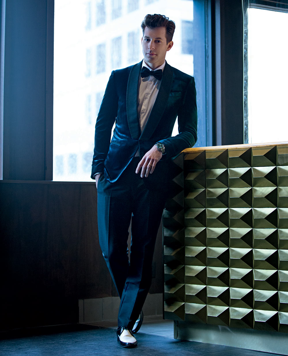 Mark Ronson is a dapper vision in a velvet dinner jacket from Bally.