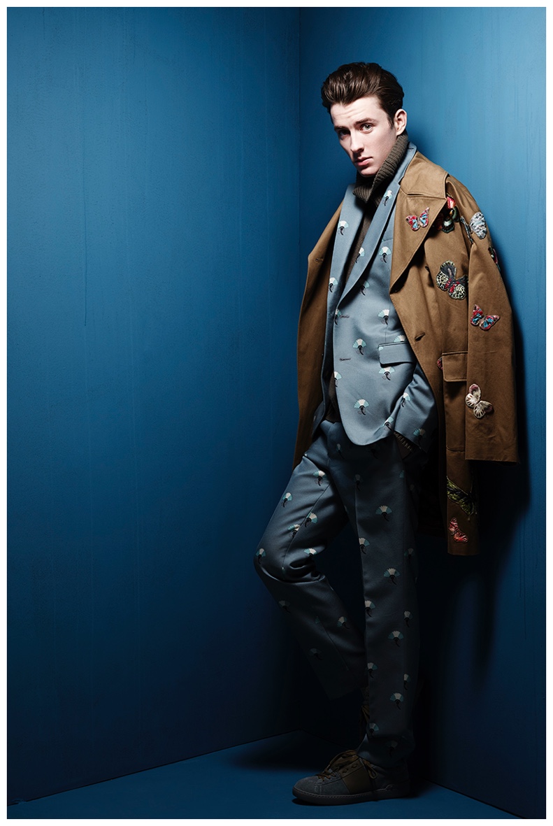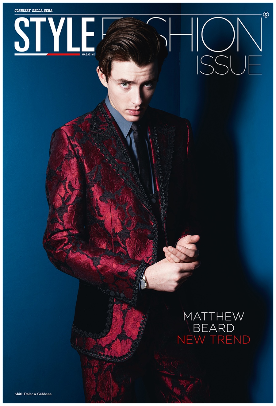 Donning a red and black, lace embellished suit from Italian fashion house Dolce & Gabbana, actor Matthew Beard covers the Style Fashion Issue supplement of Corriere della Sera magazine. Photographed by Rankin, Beard dons bold designer looks pulled together by fashion director Alessandro Calascibetta. / Grooming by Johnnie Biles (Stella Creative). Manicure by Ami Streets (LMC).