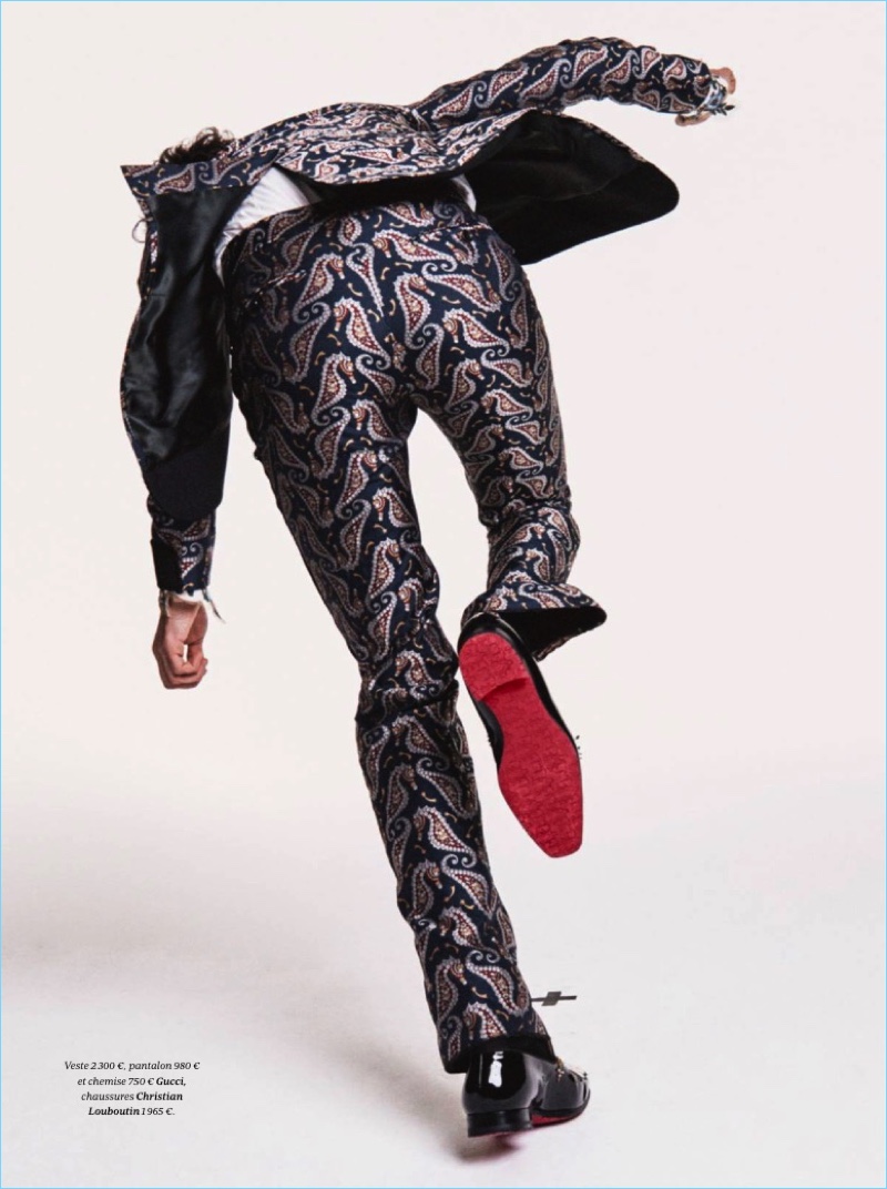 Left: Taking to the studio, Mika sports a HUGO Hugo Boss suit with a Bally shirt, Gucci tie, and Rivieras shoes. Right: Mika rocks a dandy Gucci look.Pin