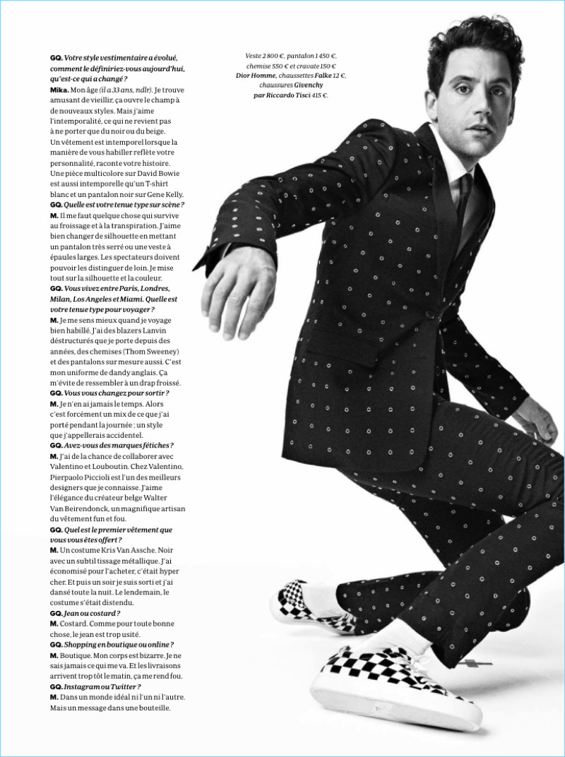 Mika graces the pages of GQ France in an Emporio Armani jacket with a Valentino shirt and Alain Figaret pocket square.