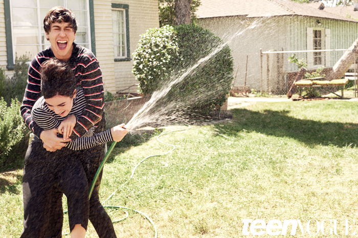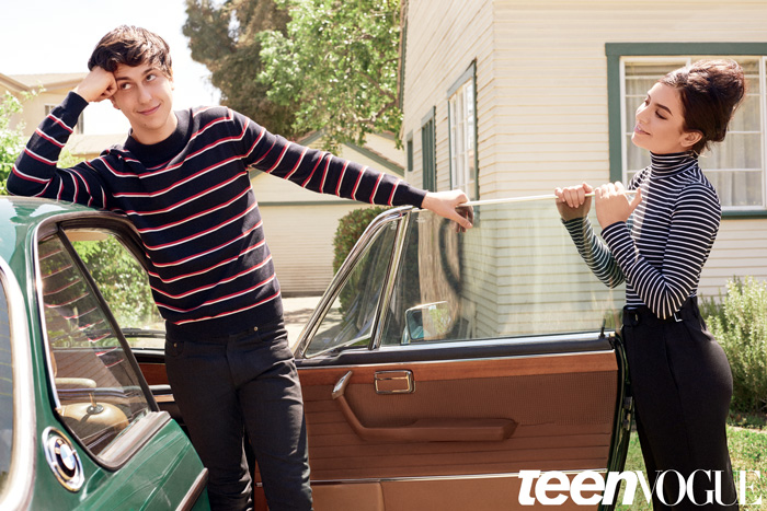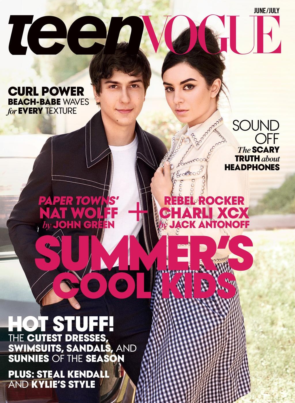 Featuring “Summer’s Cool Kids”, Teen Vogue enlists Paper Towns actors Nat Wolff and singer Charli XCX for its June/July 2015 cover story. Posing for a retro-inspired shoot, the two have fun outdoors, leading to a water fight. For the magazine’s stylish cover, Wolff is pictured in a spring-summer 2015 denim look from Italian fashion house Prada.