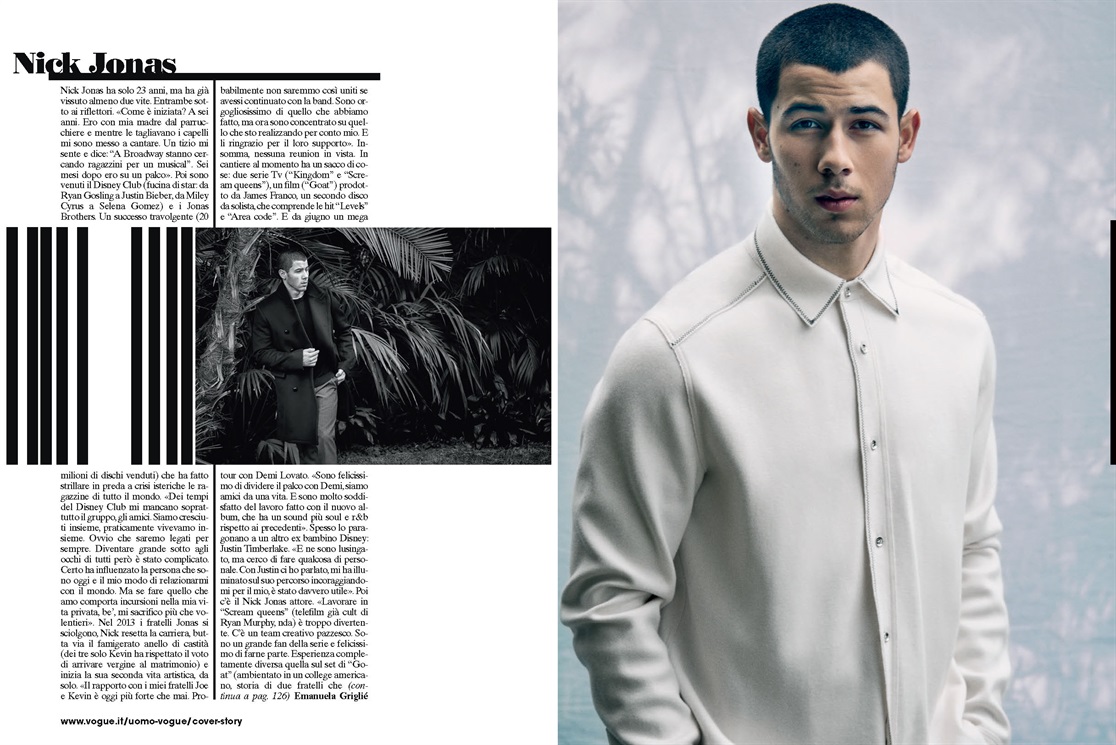 Discussing the breakup of the Jonas Brothers and his relationship with his brothers today, Jonas shares, “Nowadays my relationship with my brothers Joe and Kevin is stronger than ever. If we had continued with the band we probably wouldn’t be so close. I’m so proud of what we achieved, but now I’m concentrating on the things I’m doing for myself. And I’m grateful for their support.” Read more on Vogue.it.