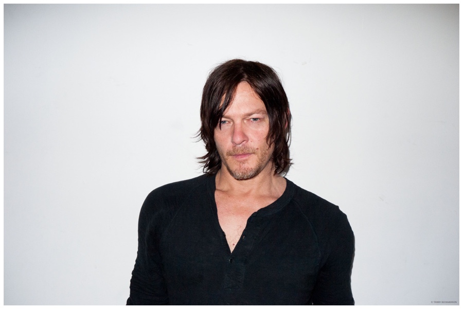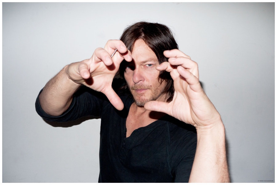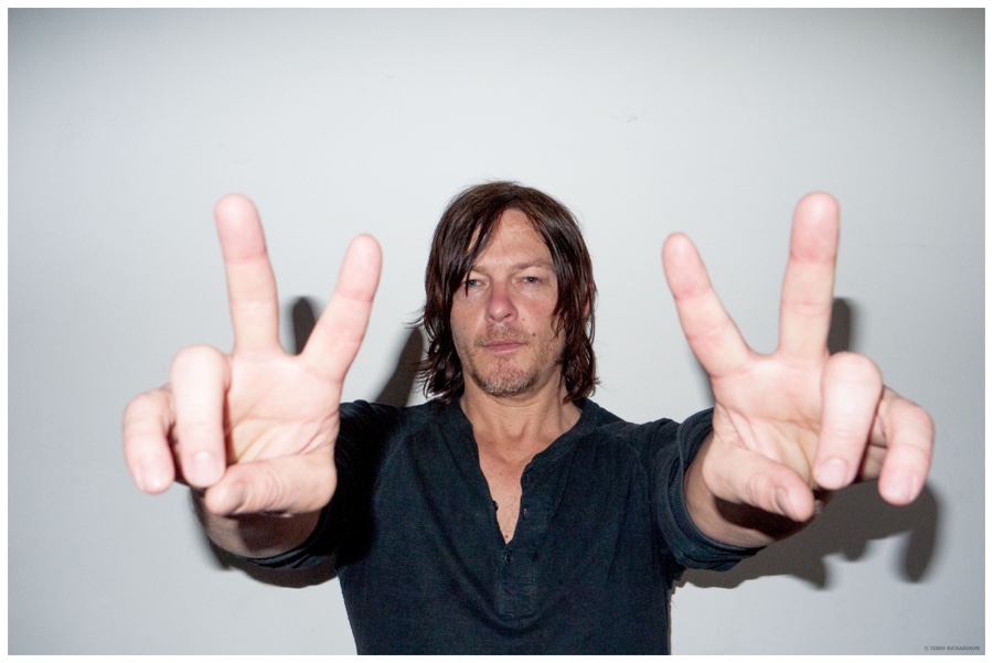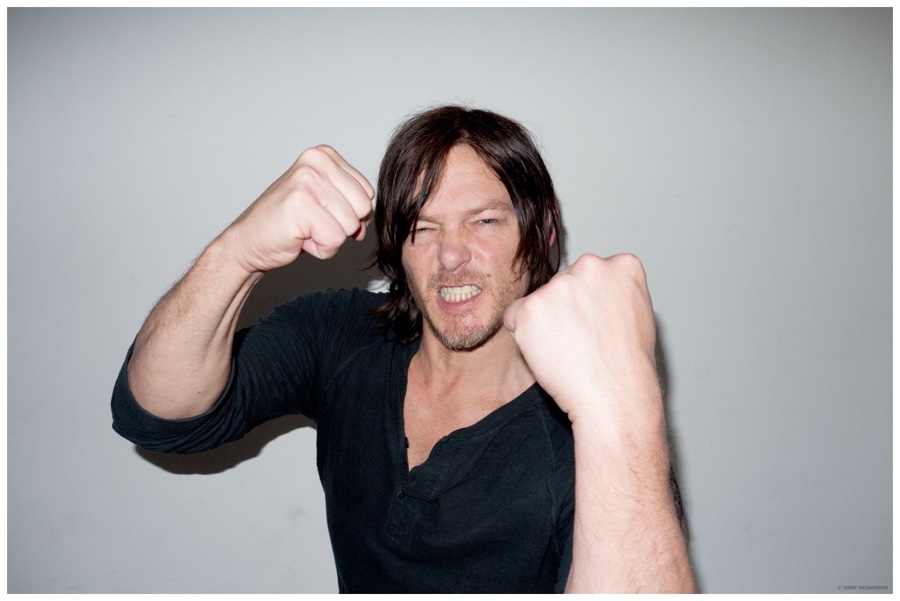 After posing for the pages of Vanity Fair Italia, photographed at the Chateau Marmont, we catch up with The Walking Dead star Norman Reedus as he steps in front of the camera once more. Reedus connects with fashion photographer Terry Richardson for a cheeky round of high contrast images. Striking his best fighting pose and showing peace signs, Reedus shows off a humorous side.