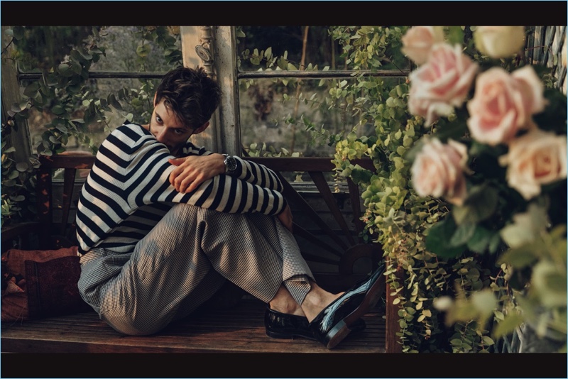 Norman Jean Roy photographs Pierre Niney in a striped Ermanno Scervino sweater with Fendi trousers and Church’s dress shoes.