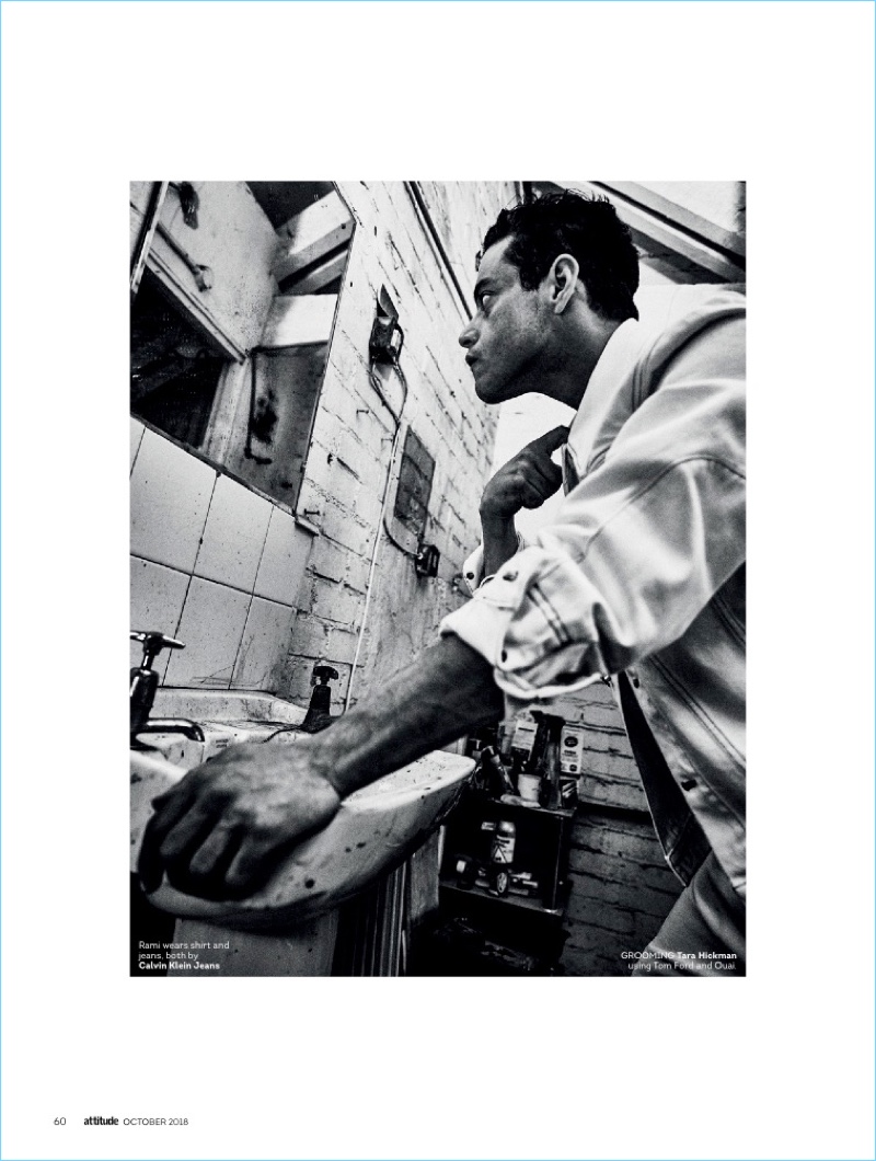 Bohemian Rhapsody star Rami Malek covers the October 2018 issue of Attitude magazine. Posing for a gritty photo shoot, Malek appears before the lens of photographer Damon Baker. Meanwhile, Joseph Kocharian handles the feature’s laid-back styling. Front and center, Malek sports fashion brands such as Saint Laurent and Calvin Klein Jeans.