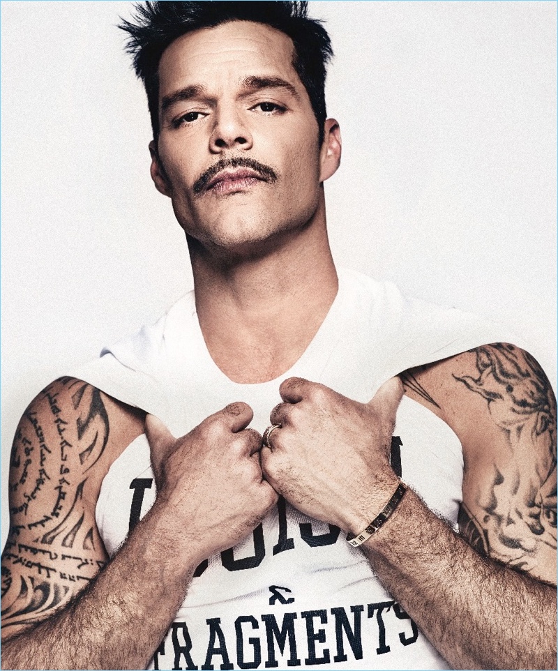 Ricky Martin is a dark dashing figure as he stars in a new photo shoot for Ocean Drive. The singer covers the magazine’s October 2017 men’s issue. Warwick Saint photographs the artist for the feature. Tapping into eclectic fall looks, stylist Douglas VanLaningham dresses Martin in brands like Prada and Louis Vuitton.