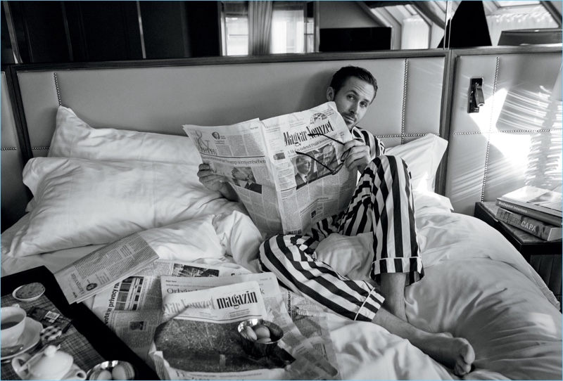 Posing for a picture in bed, Ryan Gosling dons pajamas by Sleepy Jones for GQ.