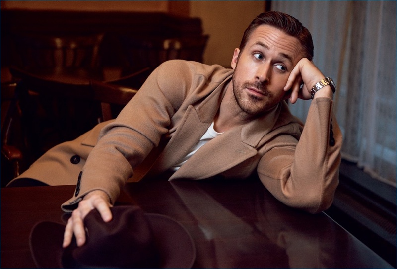 Craig McDean photographs Ryan Gosling for GQ in a Burberry coat, Tom Ford t-shirt, and Rolex watch.
