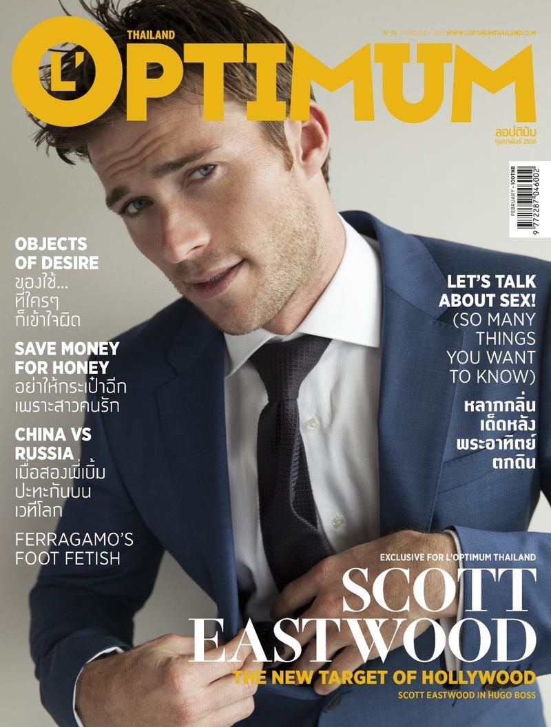 After a Yahoo! Style shoot, the increasingly popular Scott Eastwood graces the February 2015 cover of L’Optimum Thailand. The former Hugo Boss star dons a blue two-button suit from the German label for the cover image, shot by photographer Eric Silverberg.