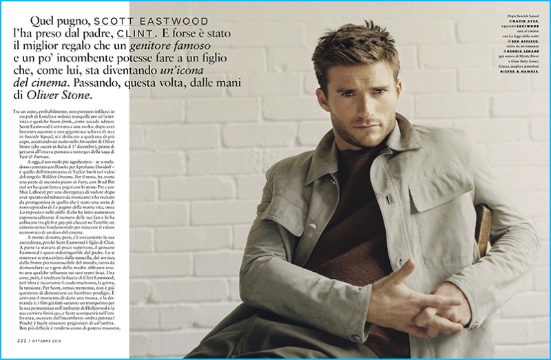 PinScott Eastwood relaxes in a look from Gieves & Hawkes for GQ Italia.PinScott Eastwood graces the pages of GQ Italia in a suede jacket from Bally with Ermenegildo Zegna pants, and Persol sunglasses for GQ Italia.PinScott Eastwood embraces a retro ease in a Tommy Hilfiger polo, worn with Giorgio Armani pants, Santoni dress shoes, and Persol glasses for GQ Italia.PinScott Eastwood sports a Bally suede jacket with an Ermenegildo Zegna shirt for GQ Italia.