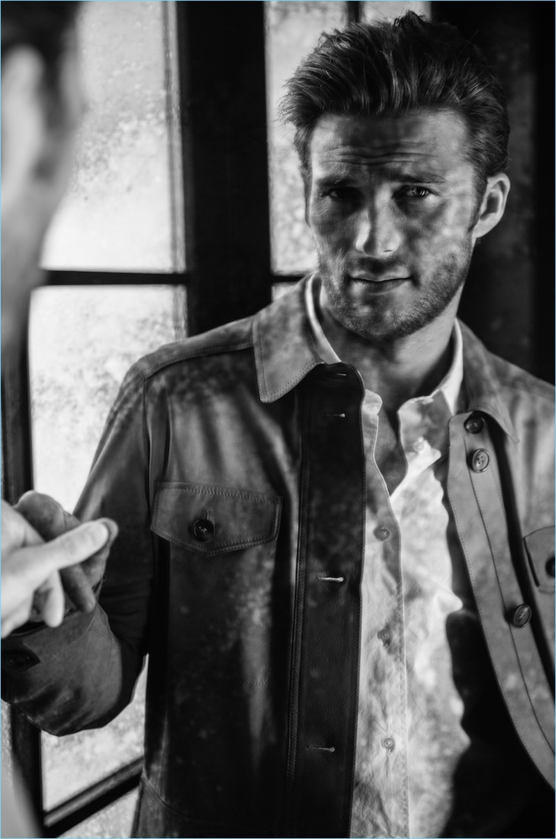 Appearing in a black and white photo, Scott Eastwood wears a Salvatore Ferragamo suit. He also dons an Acne Studios coat and Giorgio Armani shirt.