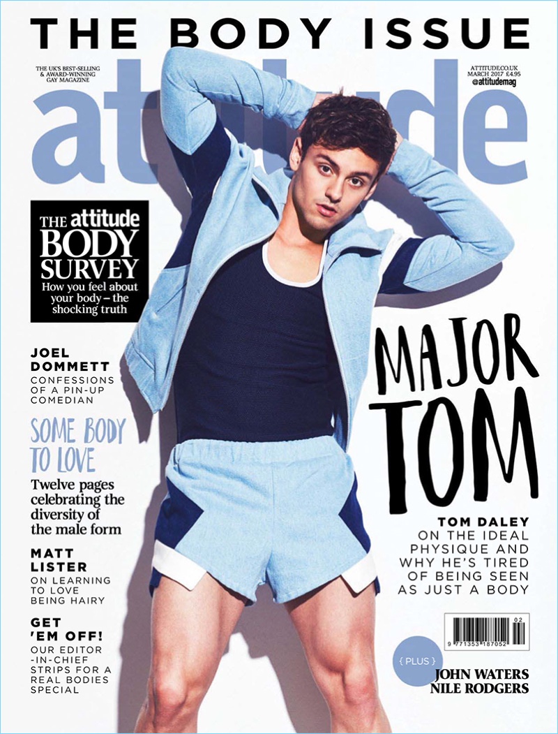 Tom Daley delivers a sporty look as he covers the March 2017 issue of Attitude. The Olympic diver links up with photographer Mark Cant and stylist Joseph Kocharian for the occasion. Embracing a designer spin on active styles, Daley wears brands such as Prada and Balmain.