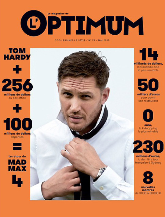 Hot on the heels of his new PETA advertisement, actor Tom Hardy continues his press tour. Covering the May 2015 issue of French magazine L’Optimum, Hardy is photographed by Greg Williams. Pictured adjusting his tie, the 37 year-old actor delivers a piercing gaze. His latest movie, Mad Max: Fury Road hits theaters May 15, 2015.