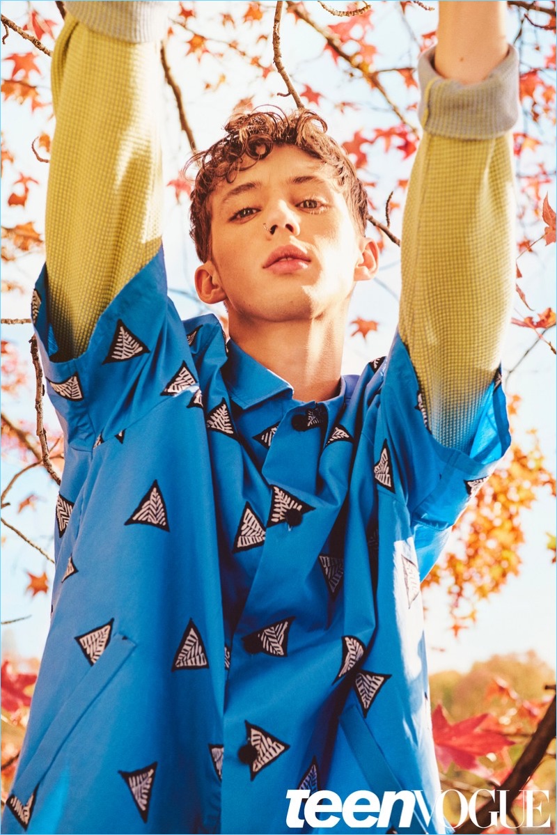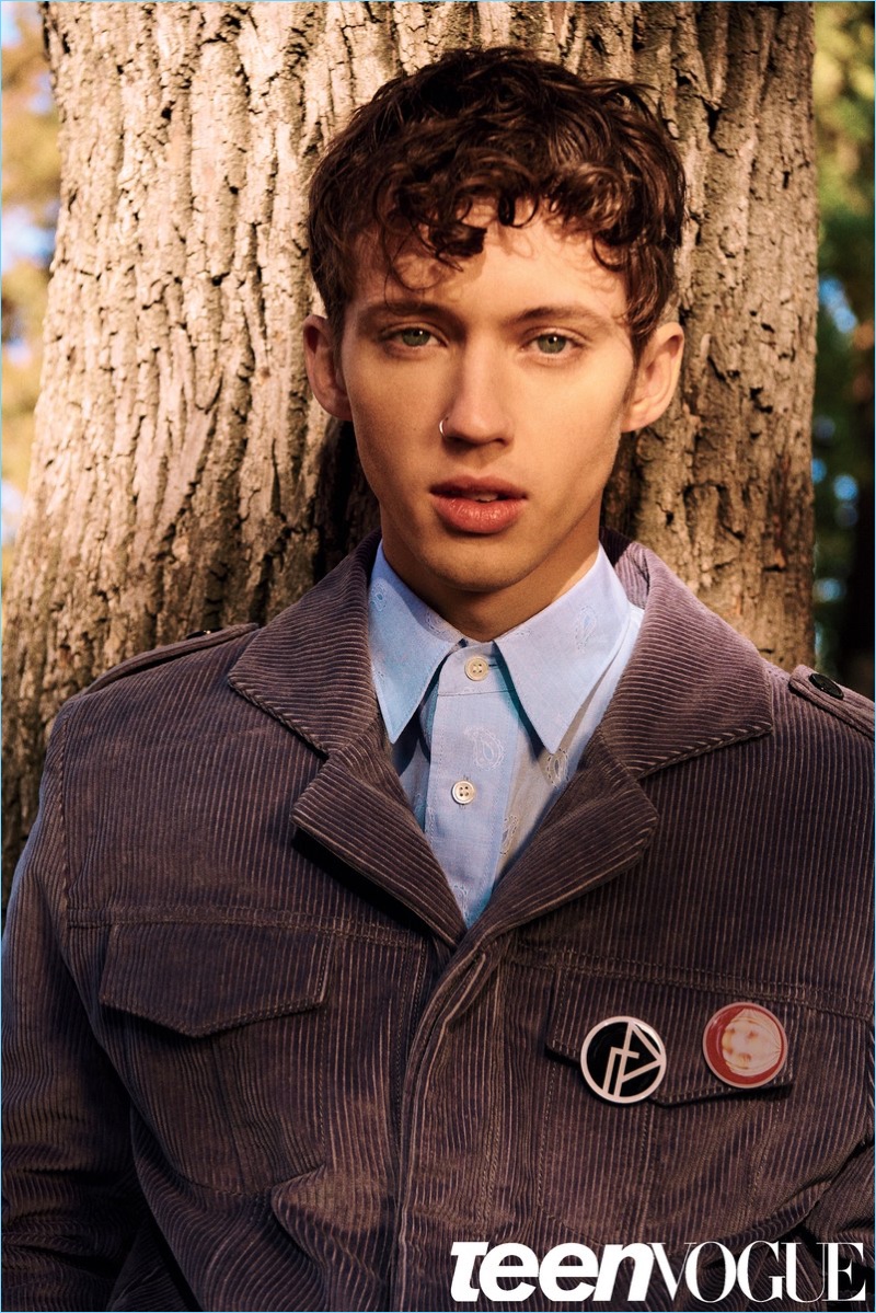 Appearing in a Teen Vogue photo shoot, Troye Sivan wears a shirt and corduroy jacket by Gosha Rubchinskiy.