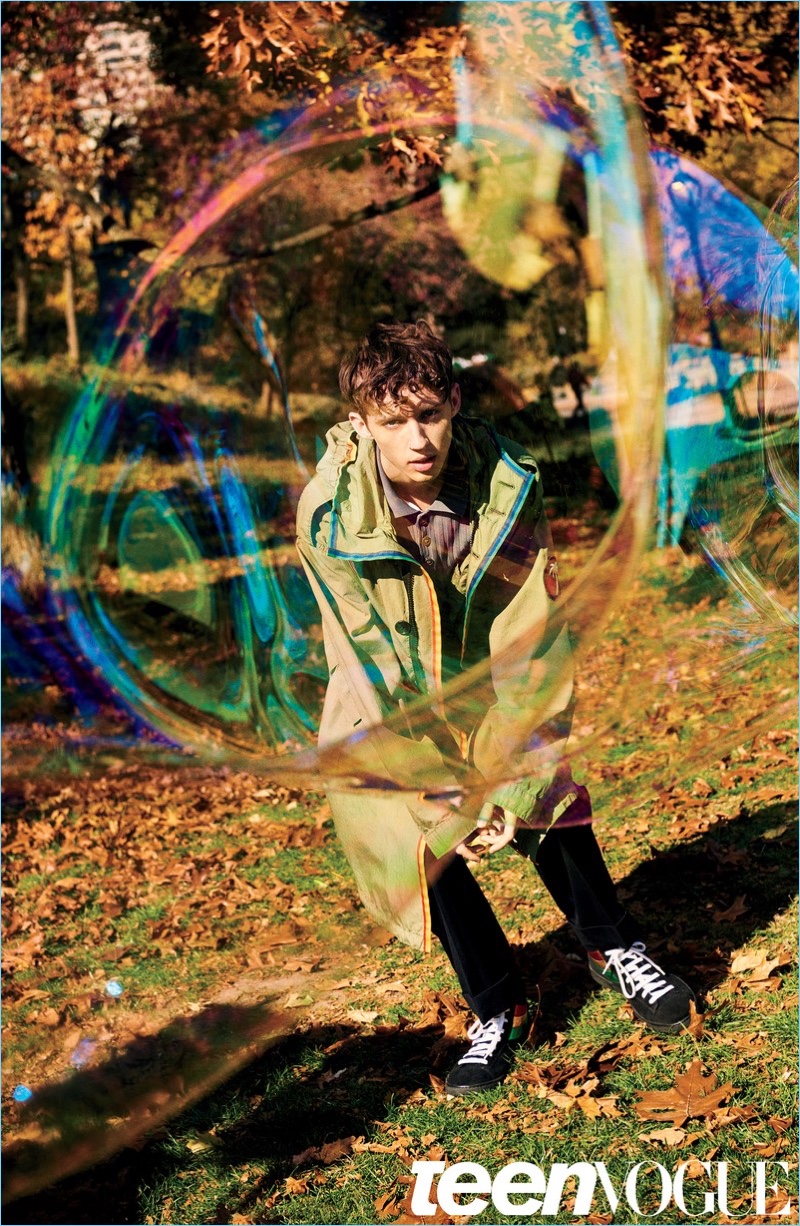 Playing with bubbles, Troye Sivan sports a Marc Jacobs parka and shoes. Sivan also wears a Valentino shirt.Pin