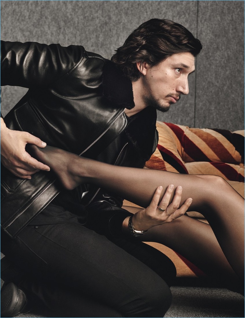 Adam Driver sports a Dior Homme leather jacket with a Rag & Bone Standard Issue t-shirt.
