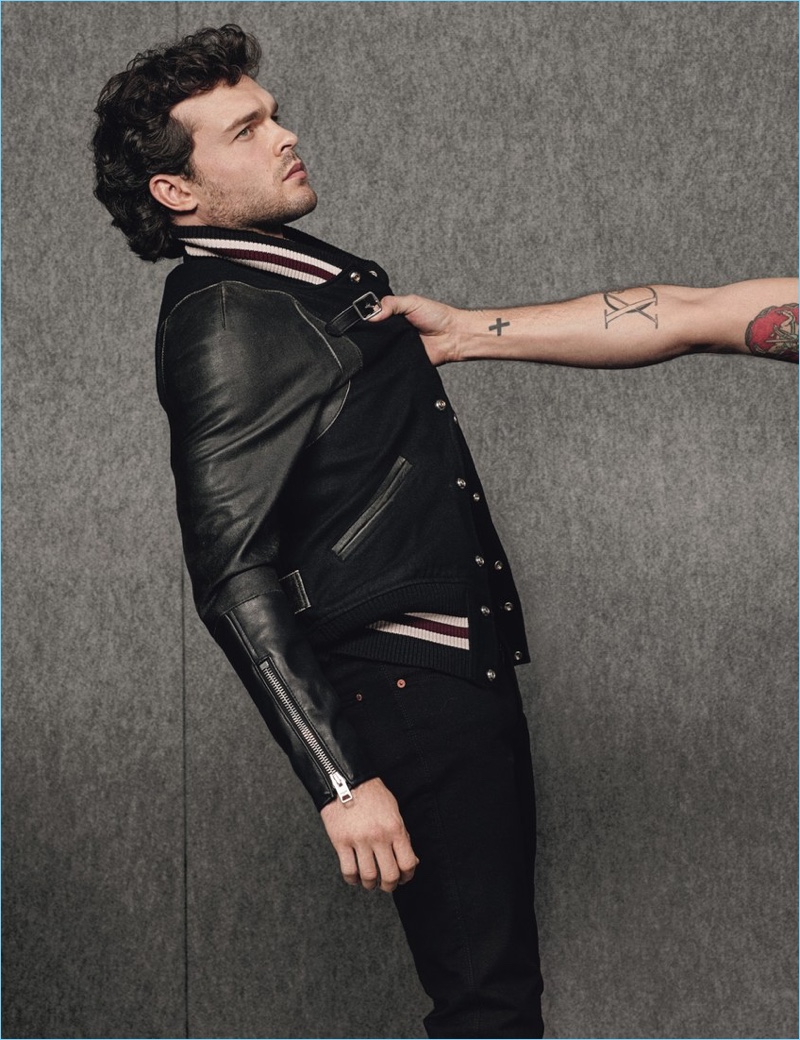 Alden Ahrenreich channels his inner greaser in a Coach 1941 leather varsity jacket and Acne Studios denim jeans.