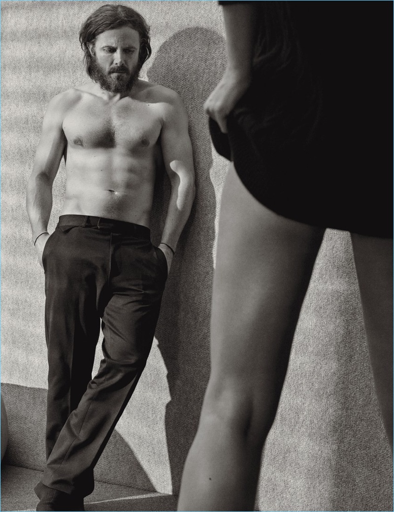 Casey Affleck goes shirtless in a pair of Louis Vuitton trousers for W magazine.